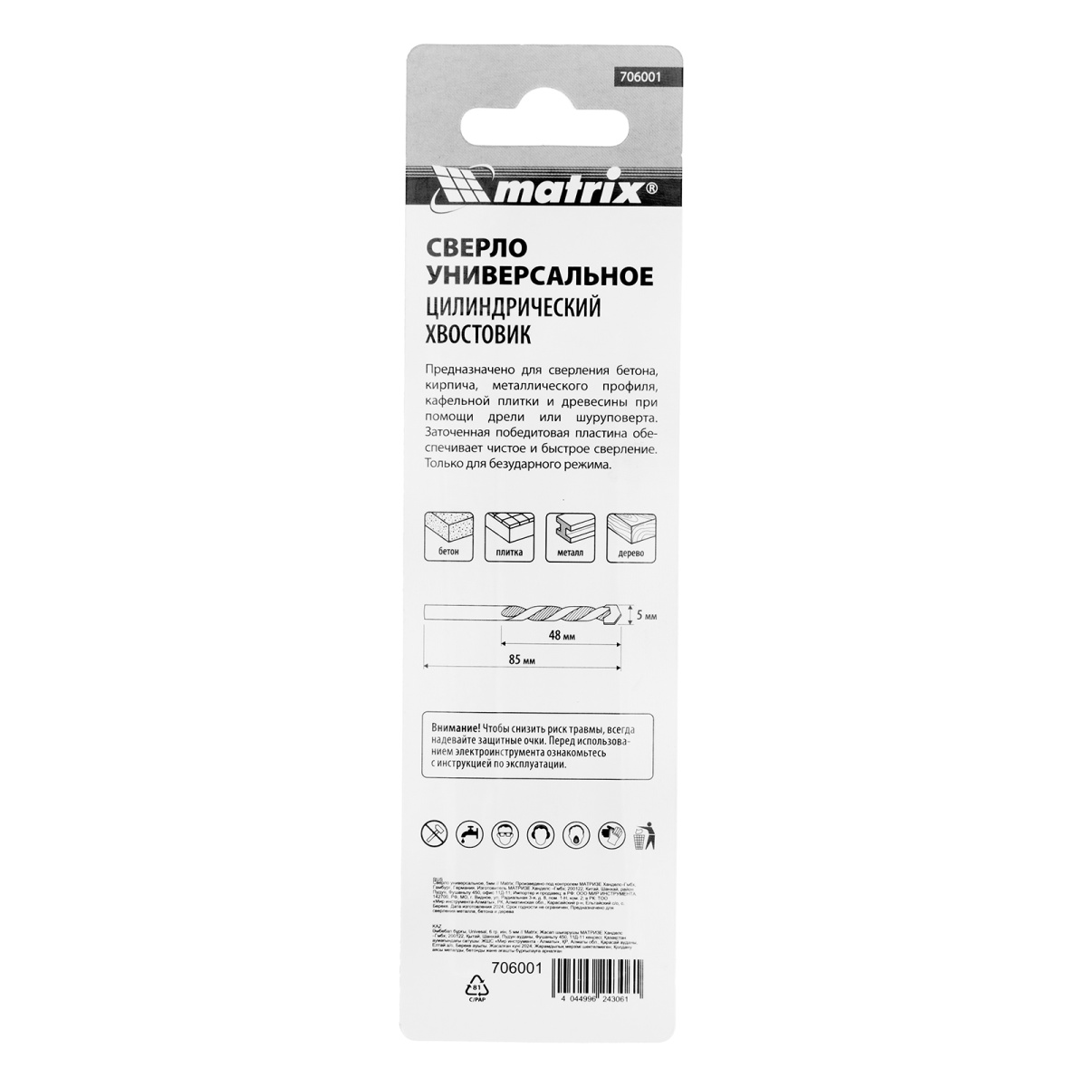 Наличие клапана для сброса давления Сверло универсальное, 5мм Matrix