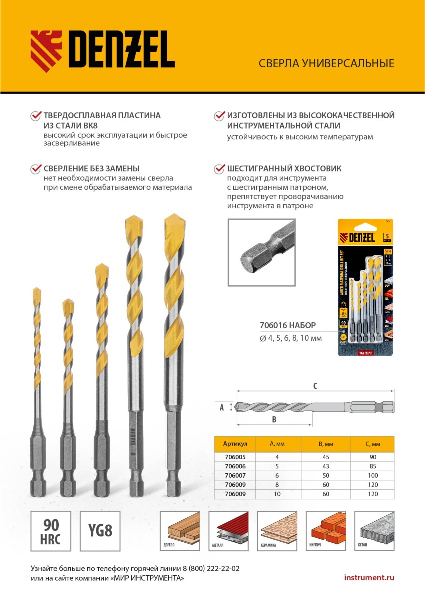 Наличие клапана для сброса давления Сверло универсальное, Multi cut, 5 мм Denzel