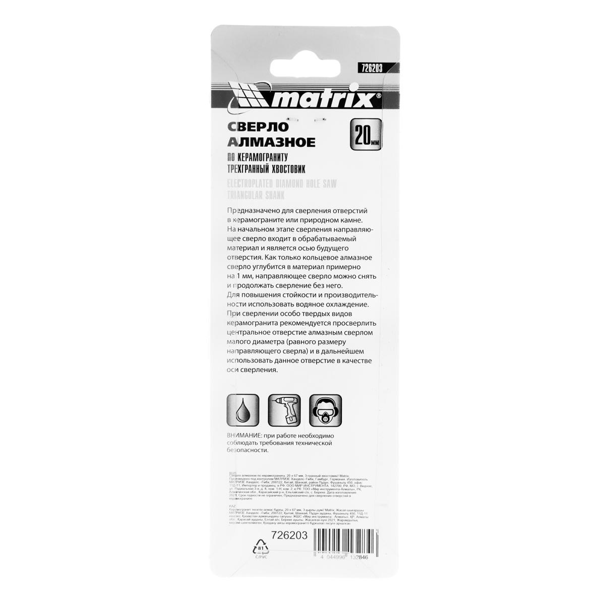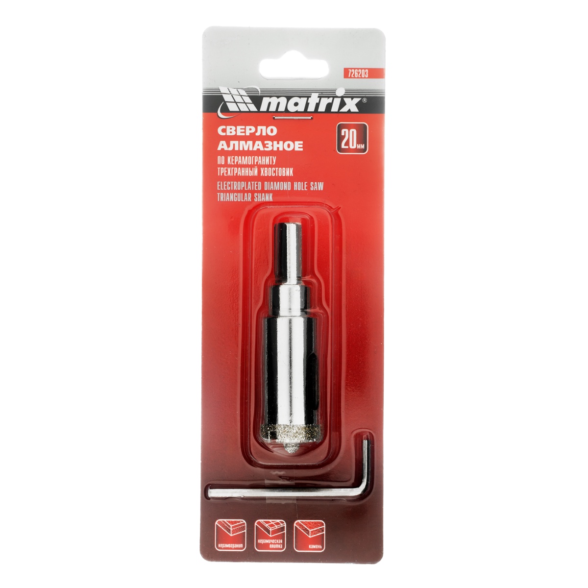 Купить Сверло алмазное по керамограниту, 20 х 67 мм, трехгранный хвостовик Matrix V6208 по лучшей цене с доставкой - интернет магазин №1 в России