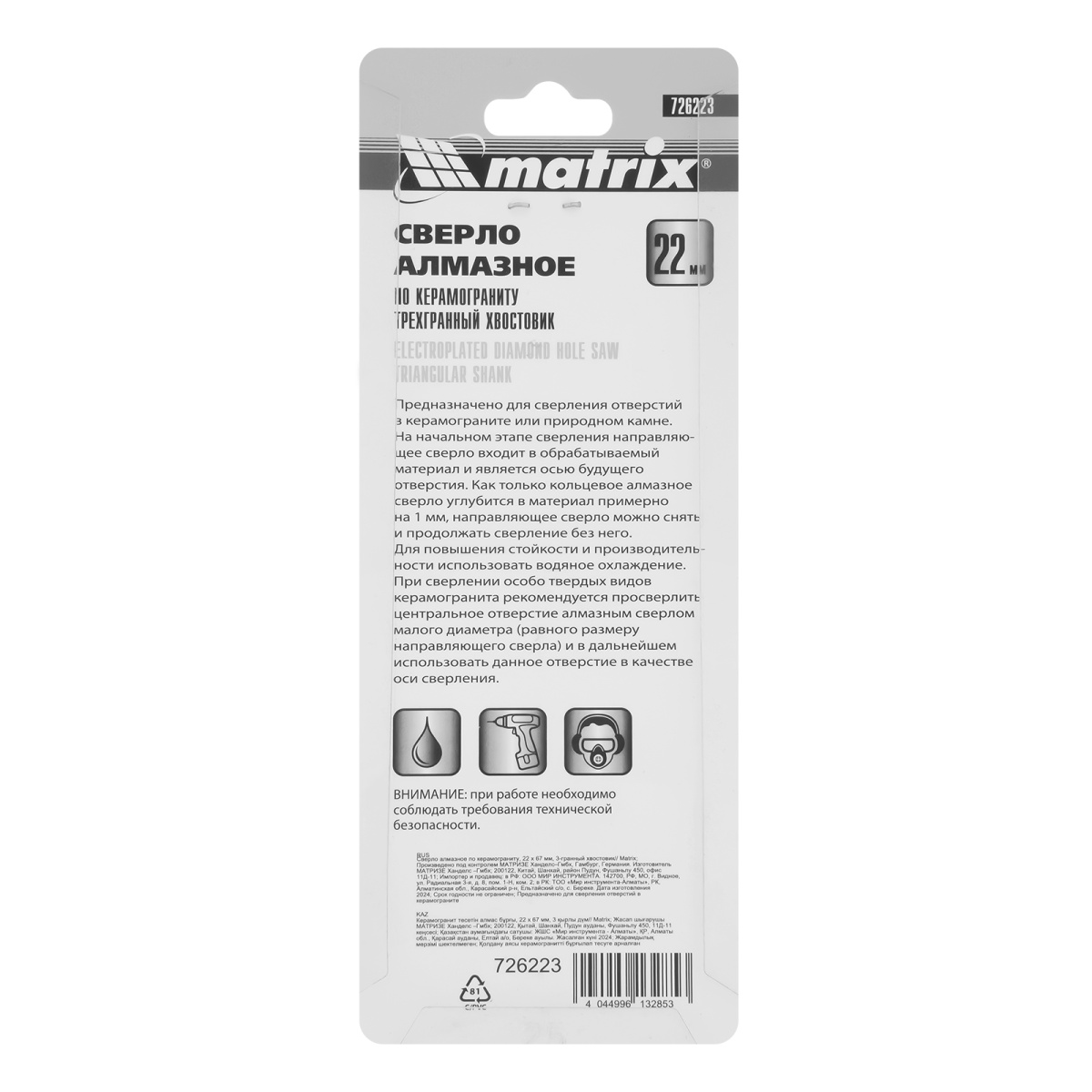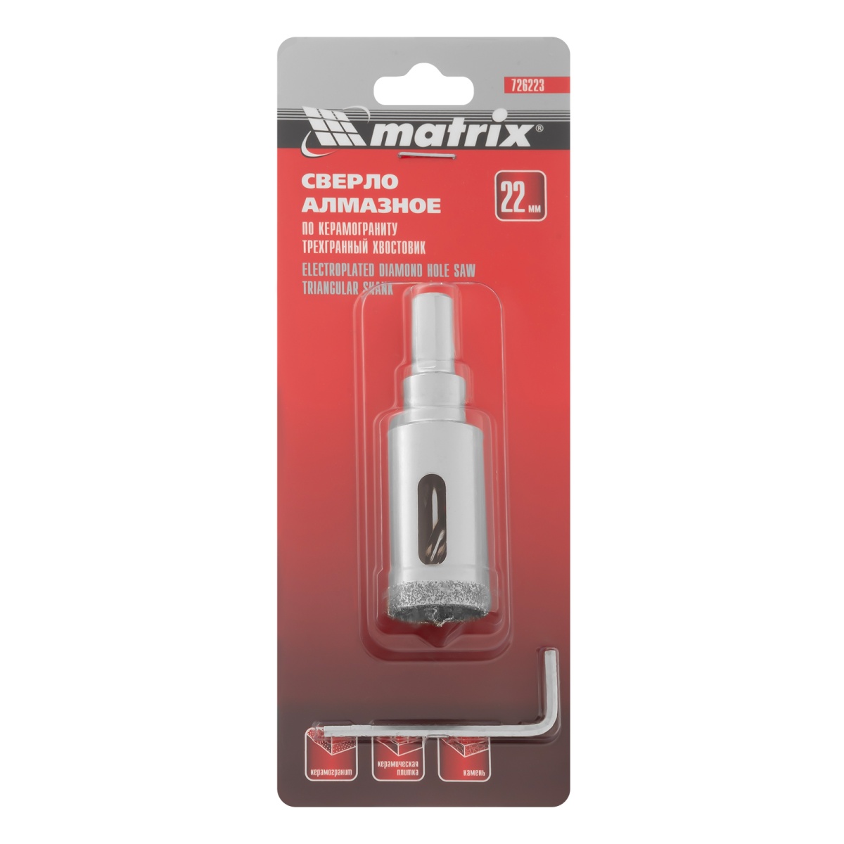 Купить Сверло алмазное по керамограниту, 22 х 67 мм, трехгранный хвостовик Matrix V6209 по лучшей цене с доставкой - интернет магазин №1 в России