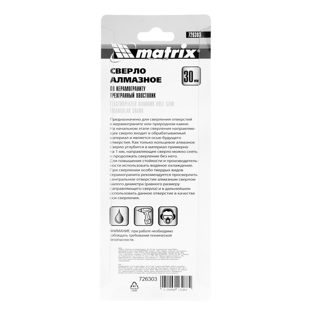 Купить Сверло алмазное по керамограниту, 30 х 67 мм, трехгранный хвостовик Matrix V6212 по лучшей цене с доставкой - интернет магазин №1 в России
