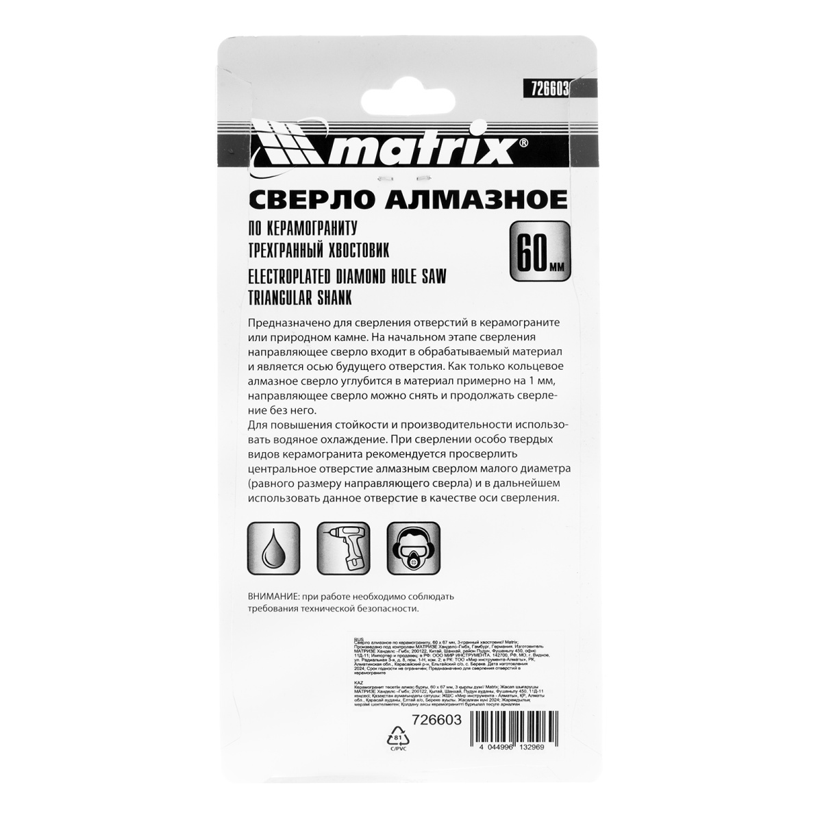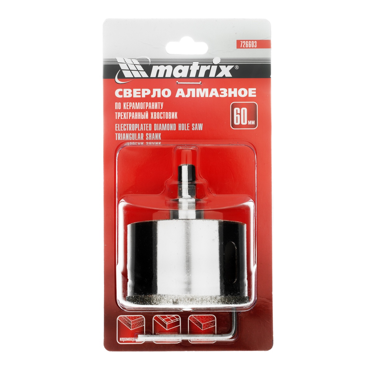 Купить Сверло алмазное по керамограниту, 60 х 67 мм, трехгранный хвостовик Matrix V6221 по лучшей цене с доставкой - интернет магазин №1 в России
