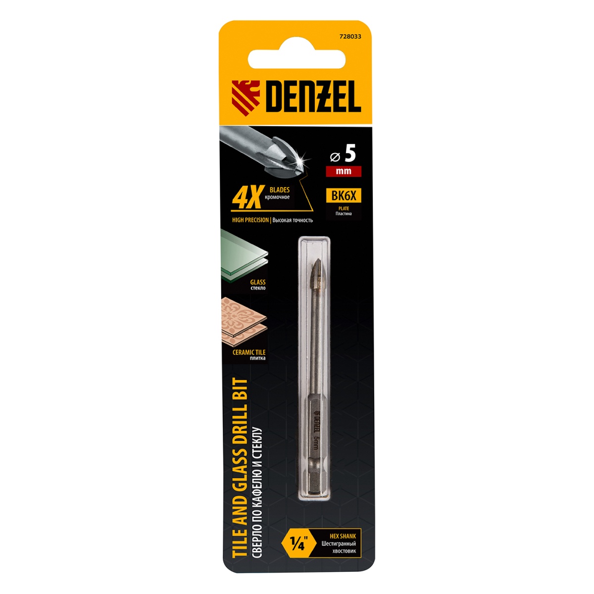 Купить Сверло по керамической плитке 5 мм, крестовая пластина, шестигранный хвостовик// Denzel V6345 по лучшей цене с доставкой - интернет магазин №1 в России