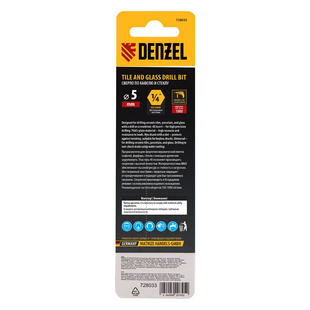 Наличие клапана для сброса давления Сверло по керамической плитке 5 мм, крестовая пластина, шестигранный хвостовик// Denzel