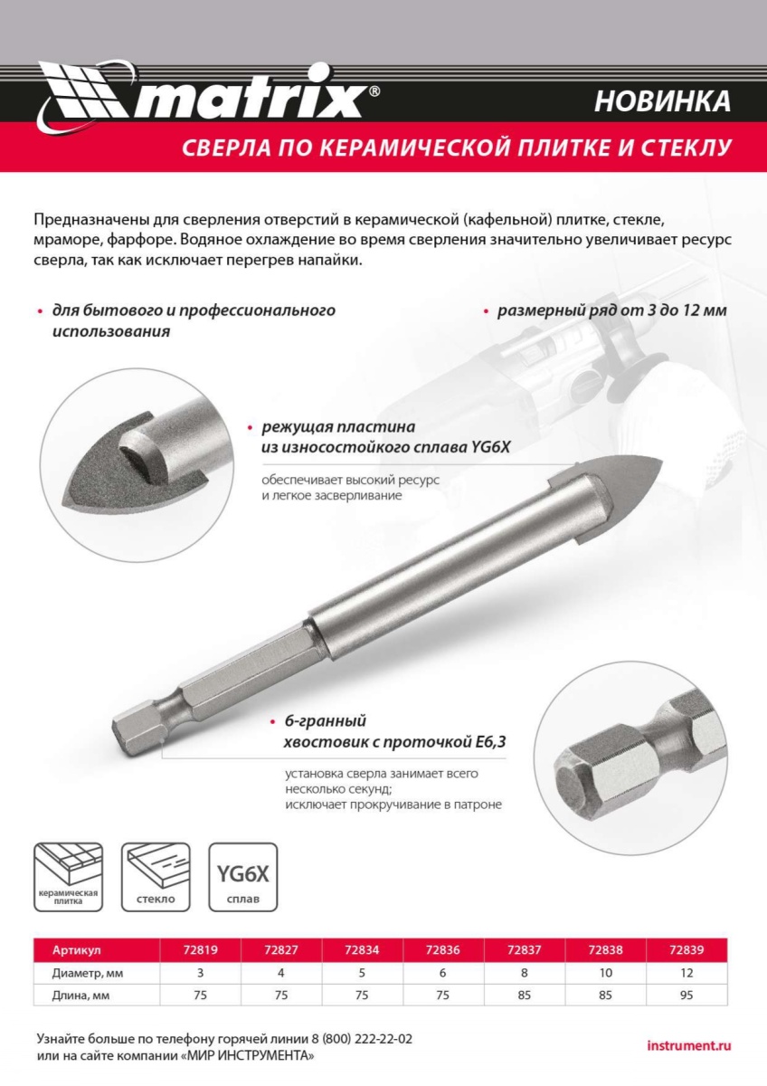 Купить Сверло по керамической плитке и стеклу, 10 мм, шестигранный хвостовик Matrix V6348 по лучшей цене с доставкой - интернет магазин №1 в России