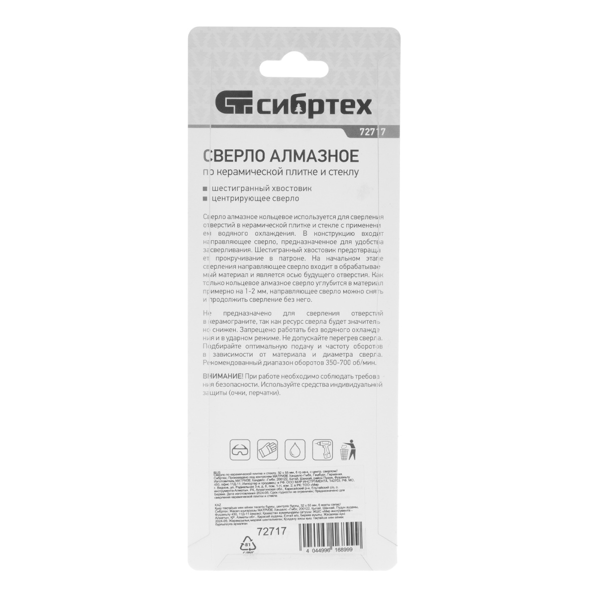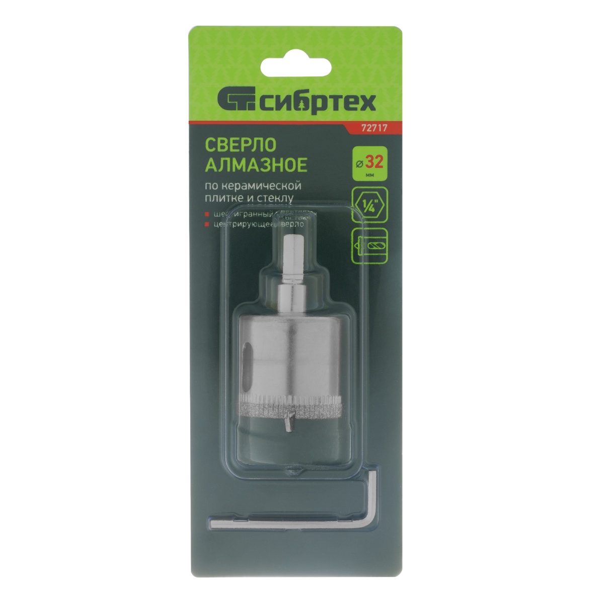 Купить Сверло по керамической плитке и стеклу, 32 х 55 мм, шестигранный хвостовик, с центрующим сверлом Сибртех V6353 по лучшей цене с доставкой - интернет магазин №1 в России