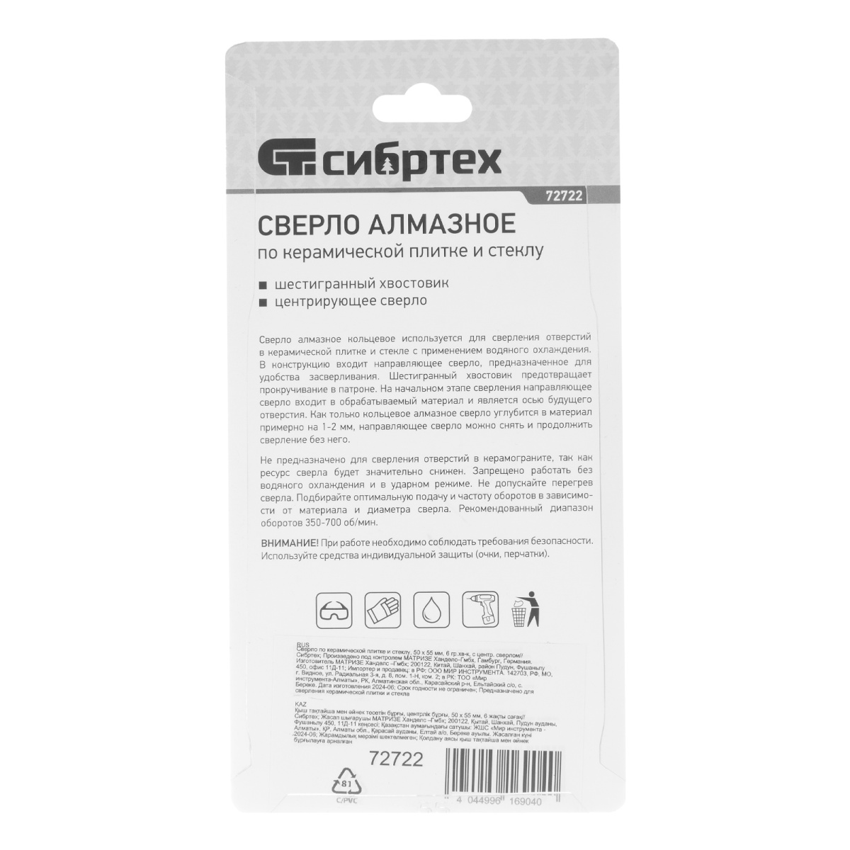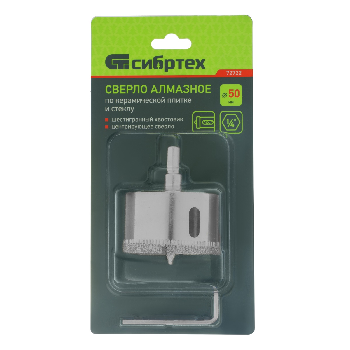 Купить Сверло по керамической плитке и стеклу, 50 х 55 мм, шестигранный хвостовик, с центрующим сверлом Сибртех V6358 по лучшей цене с доставкой - интернет магазин №1 в России
