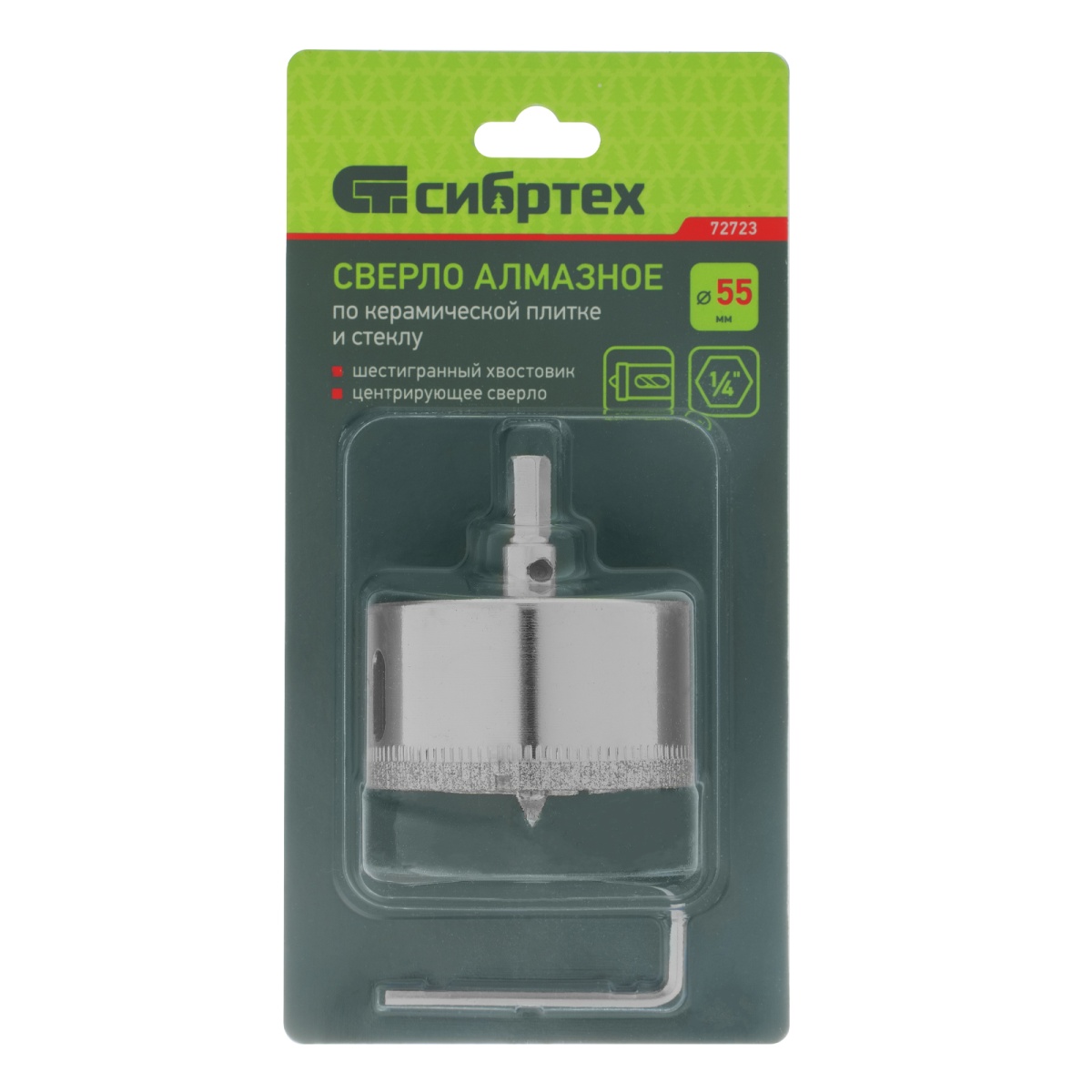 Купить Сверло по керамической плитке и стеклу, 55 х 55 мм, шестигранный хвостовик, с центрующим сверлом Сибртех V6359 по лучшей цене с доставкой - интернет магазин №1 в России