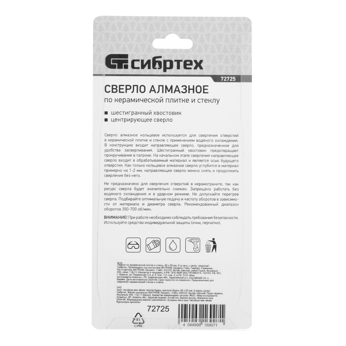 Наличие клапана для сброса давления Сверло по керамической плитке и стеклу, 65 х 55 мм, шестигранный хвостовик, с центрующим сверлом Сибртех