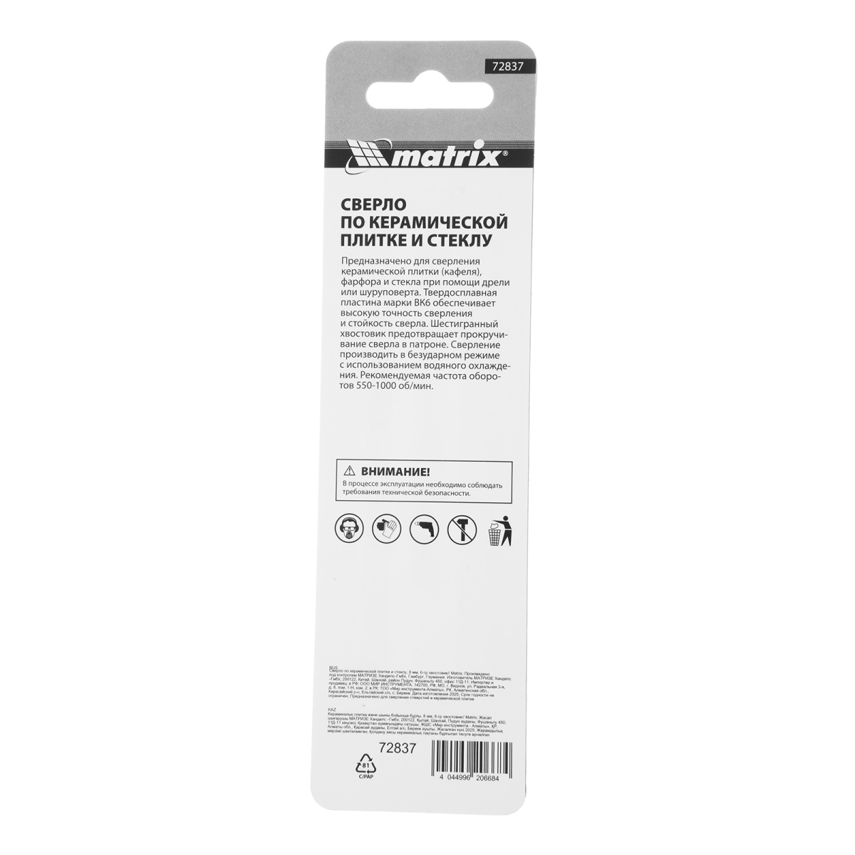 Наличие клапана для сброса давления Сверло по керамической плитке и стеклу, 8 мм, шестигранный хвостовик Matrix