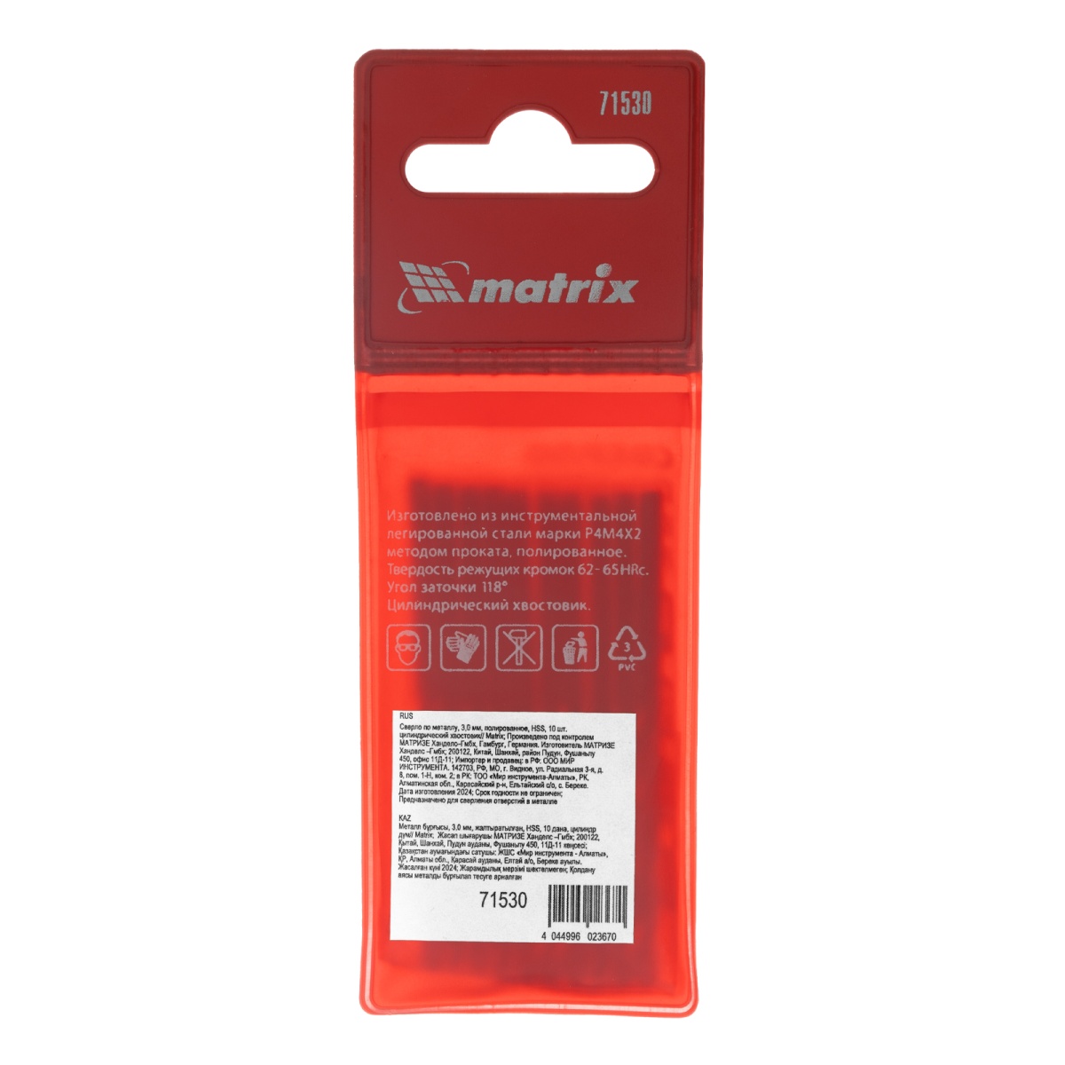 Купить Сверло по металлу, 3 мм, полированное, HSS, 10 шт, цилиндрический хвостовик Matrix V6408 по лучшей цене с доставкой - интернет магазин №1 в России