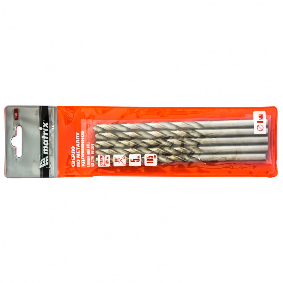 Купить Сверло по металлу, 8 х 165 мм, полированное, удл, HSS, 5 шт, цилиндрический хвостовик Matrix V6468 по лучшей цене с доставкой - интернет магазин №1 в России