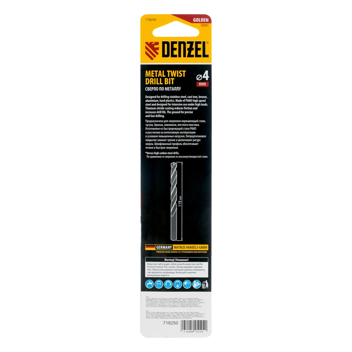 Купить Сверло спиральное по металлу 4 х 119 мм, Р6М5, Golden Tip, удлиненное Denzel V6490 по лучшей цене с доставкой - интернет магазин №1 в России
