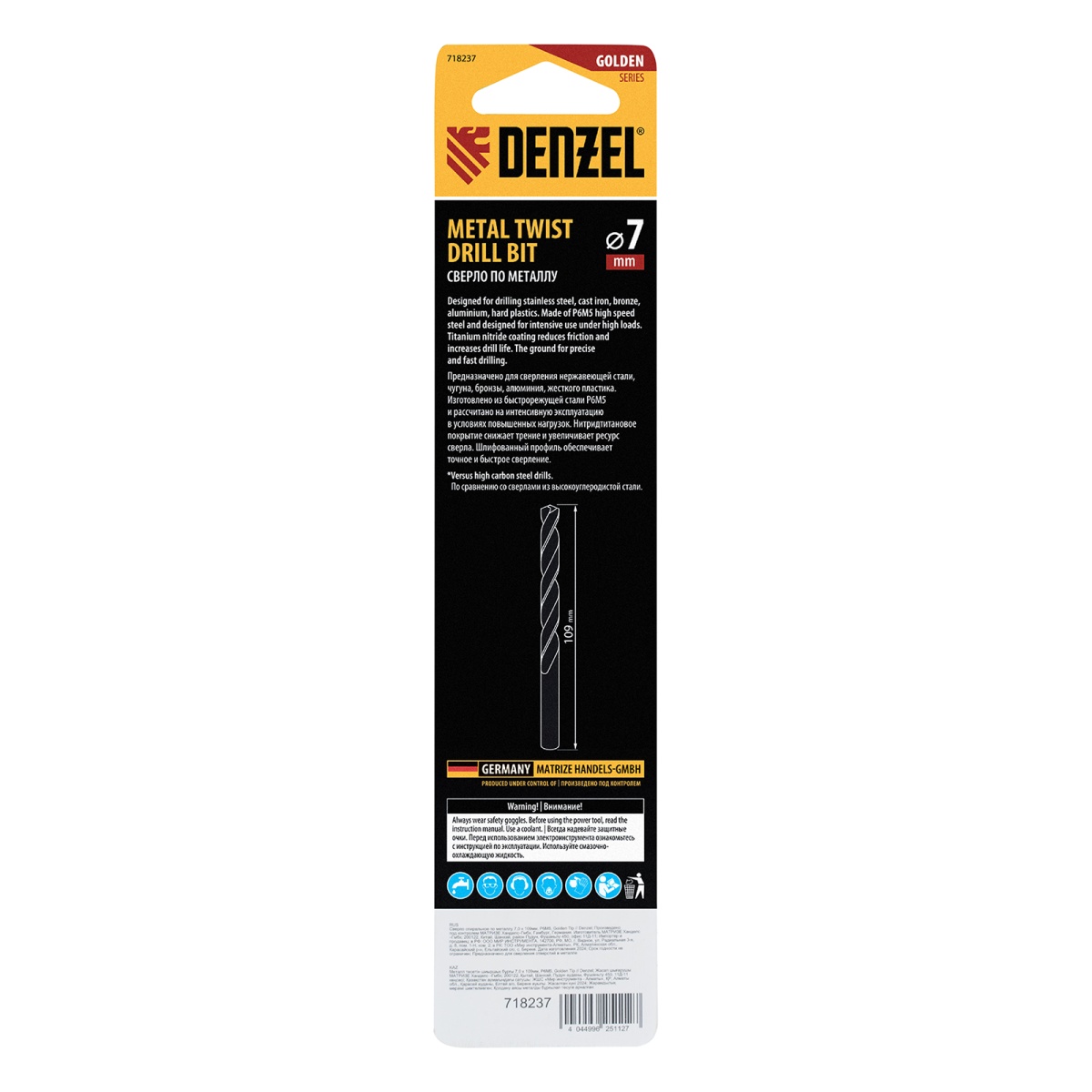 Сверло спиральное по металлу 7,0 x 109 мм, Р6М5, Golden Tip Denzel