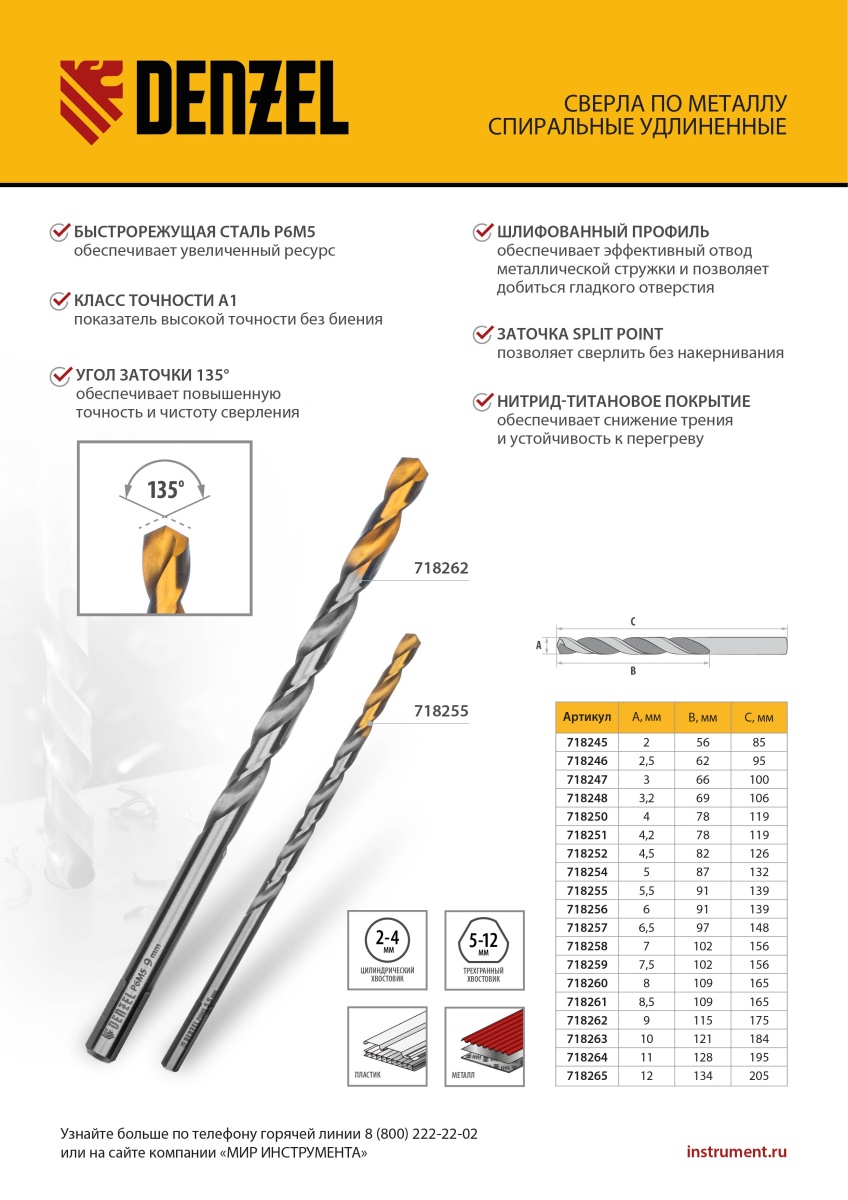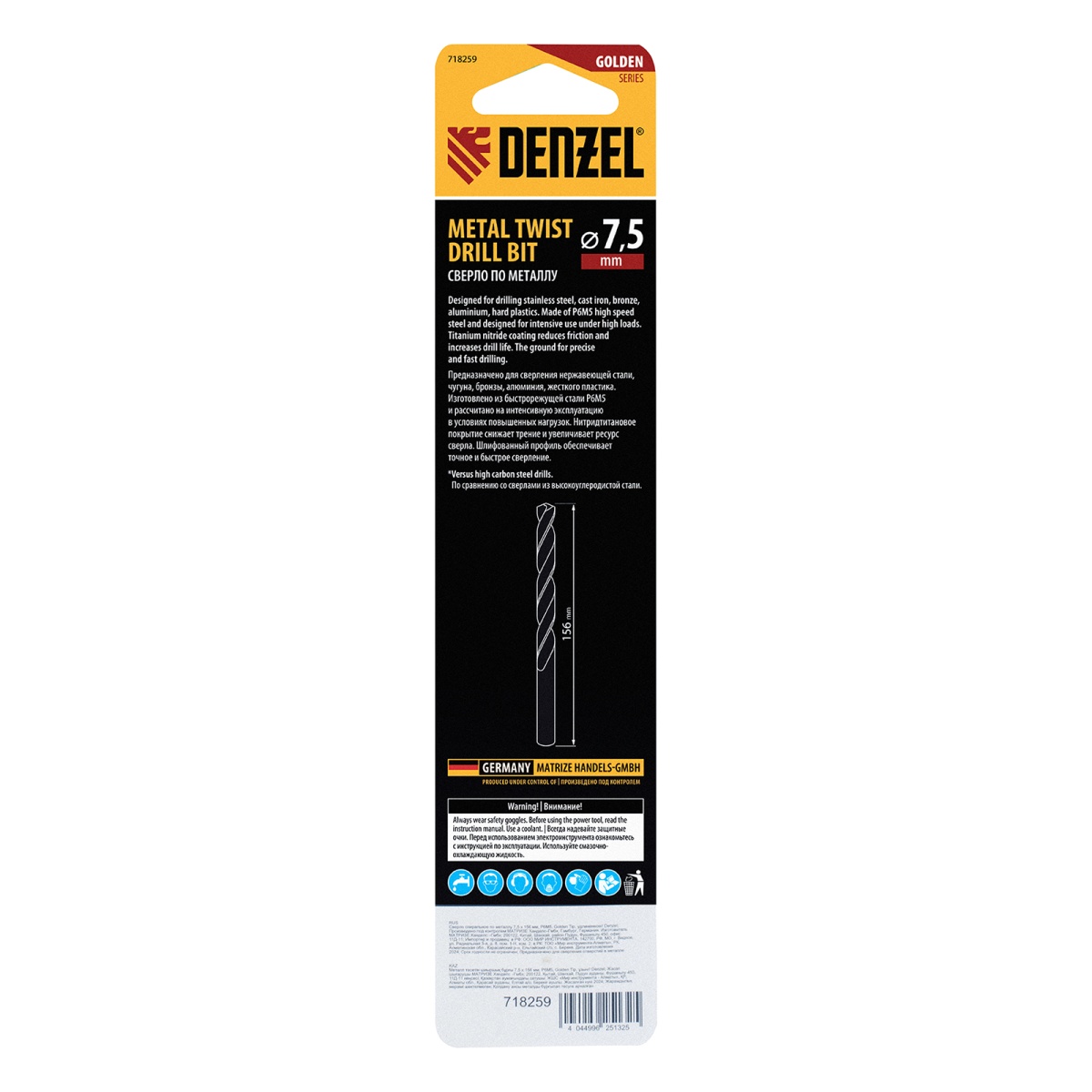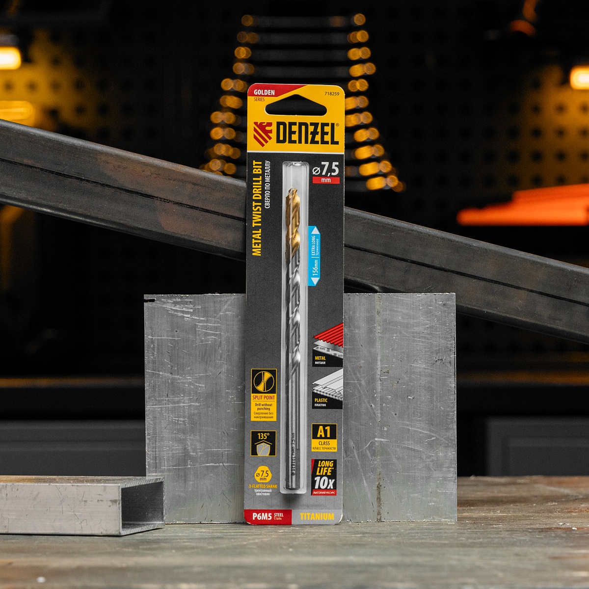 Купить Сверло спиральное по металлу 7,5 х 156 мм, Р6М5, Golden Tip, удлиненное Denzel V6503 по лучшей цене с доставкой - интернет магазин №1 в России