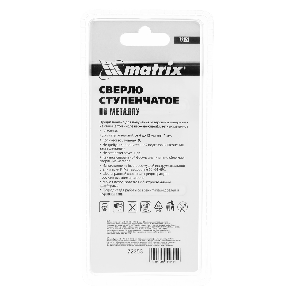 Наличие клапана для сброса давления Сверло ступенчатое 4-5-6-7-8-9-10-11-12 мм, HSS, спиральный профиль, шестигранный хвостовик Matrix