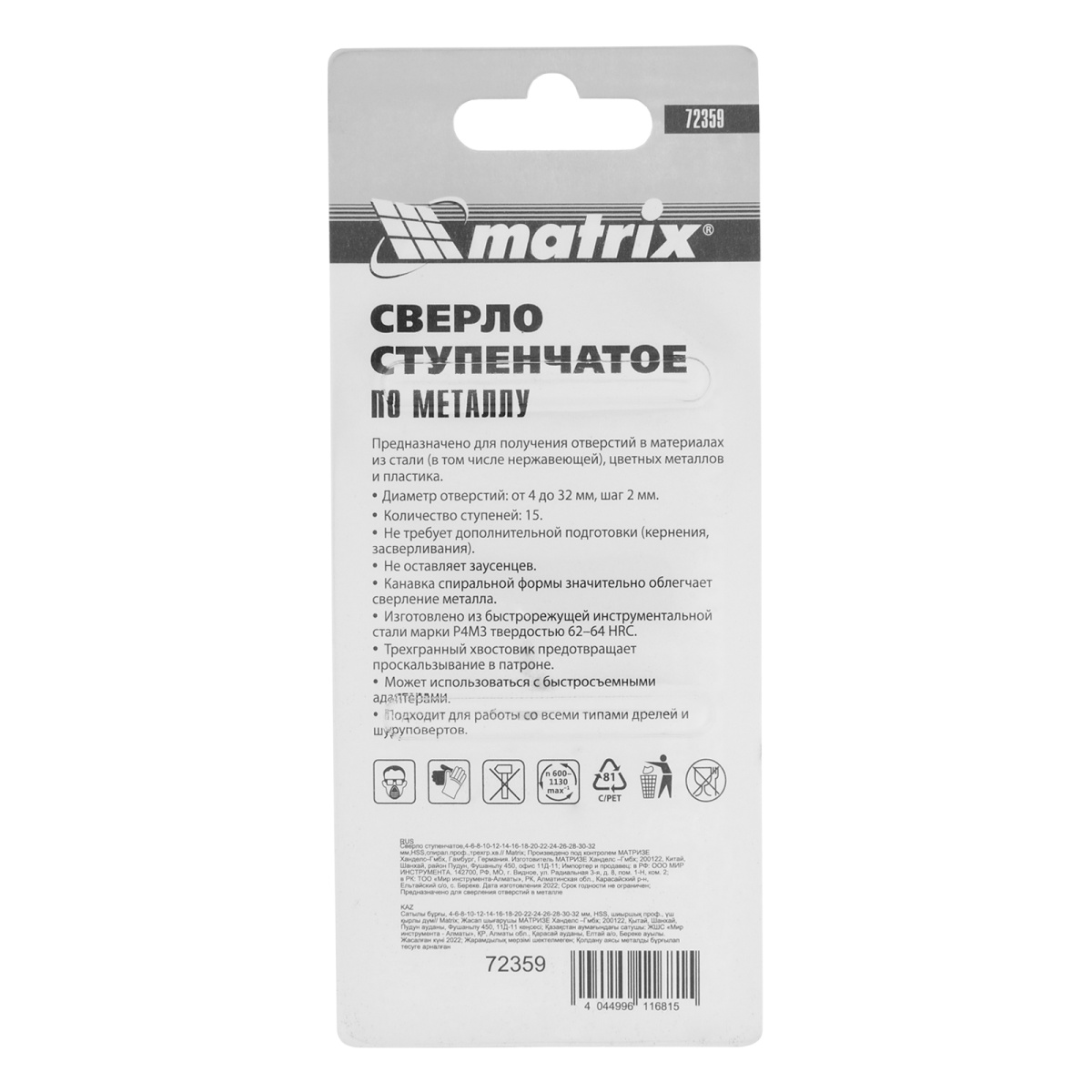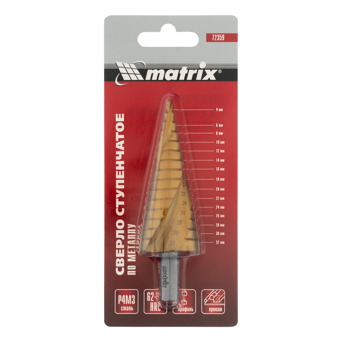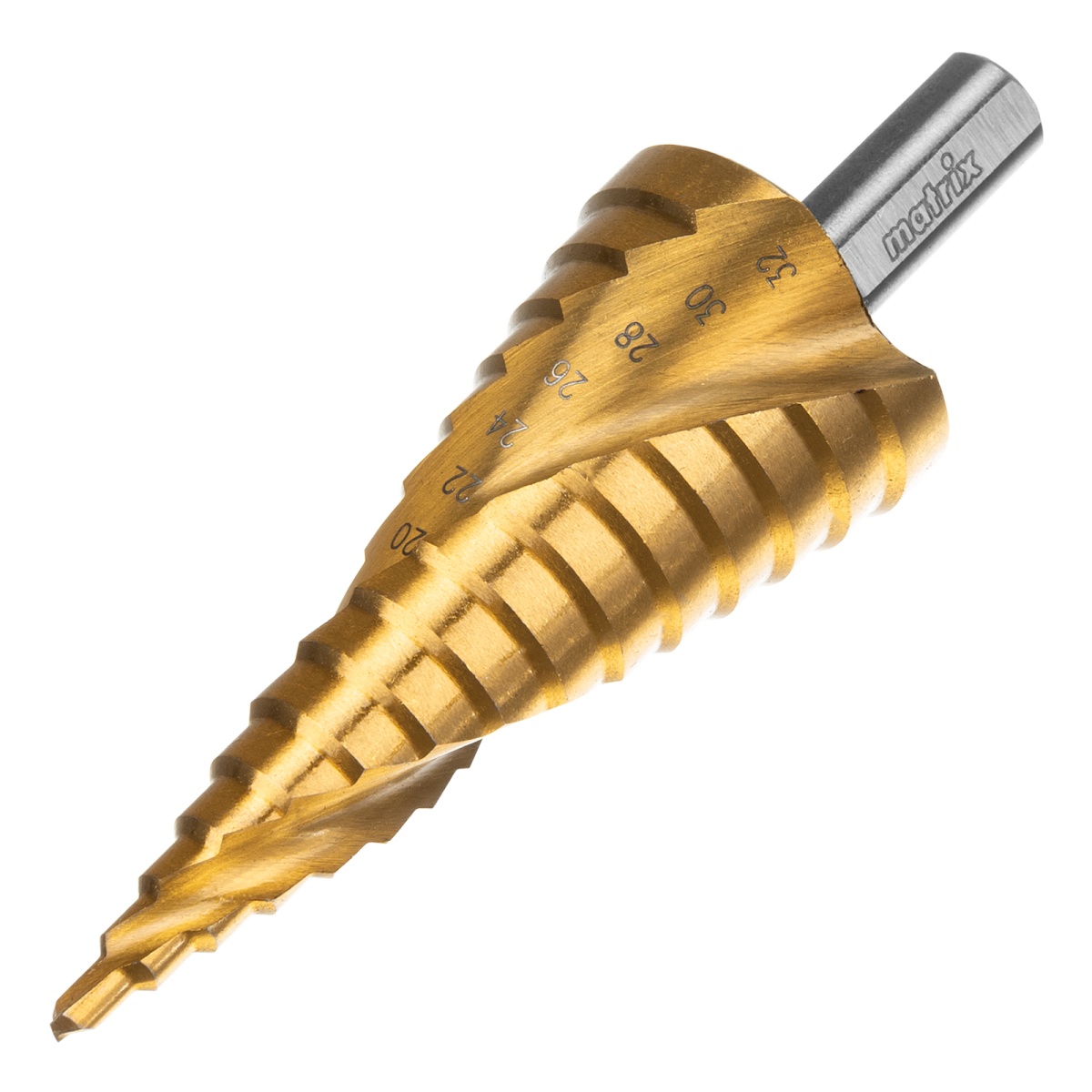 Купить Сверло ступенчатое, 4-6-8-10-12-14-16-18-20-22-24-26-28-30-32 мм, HSS, спиральный профиль, трехгранный хвостовик Matrix V6522 по лучшей цене с доставкой - интернет магазин №1 в России