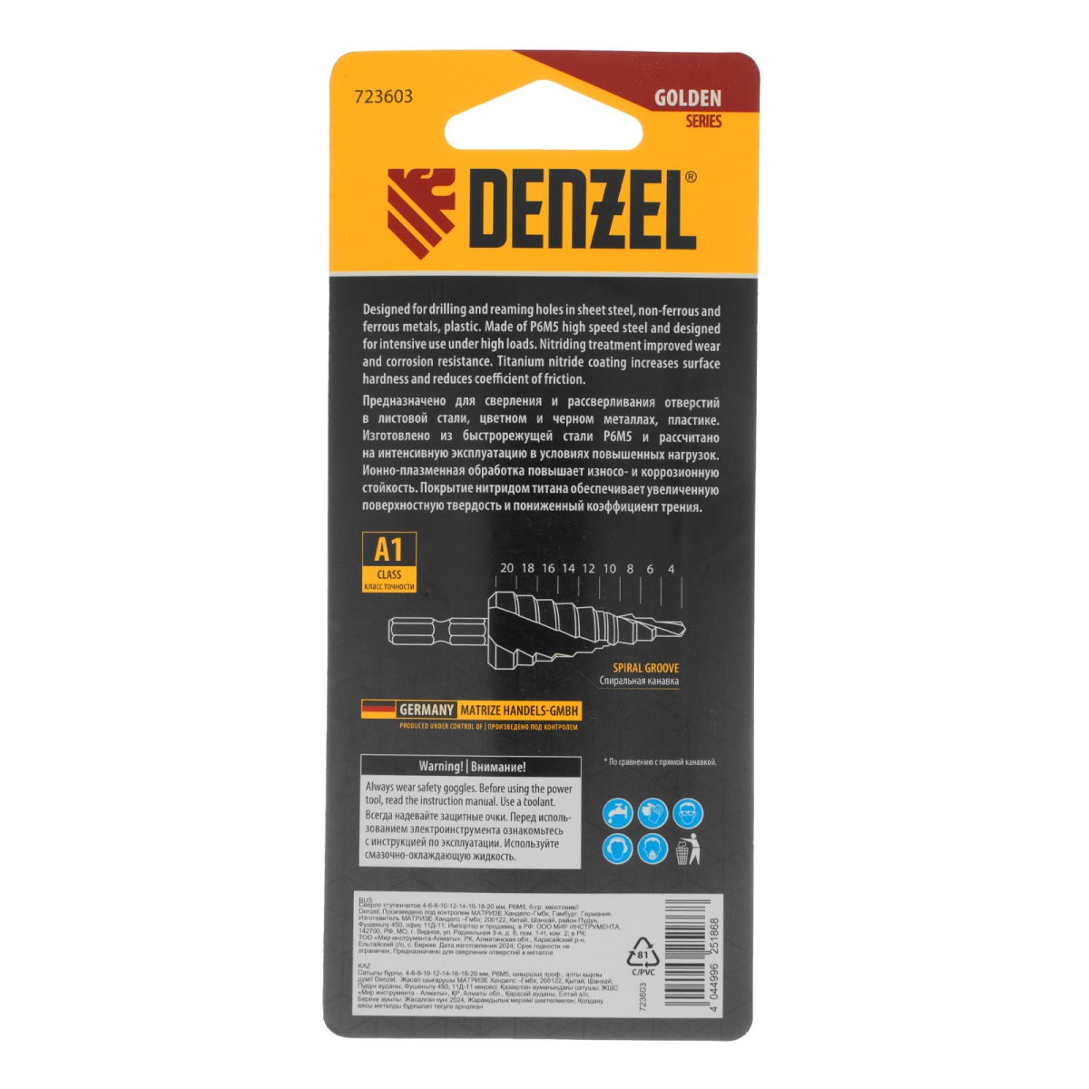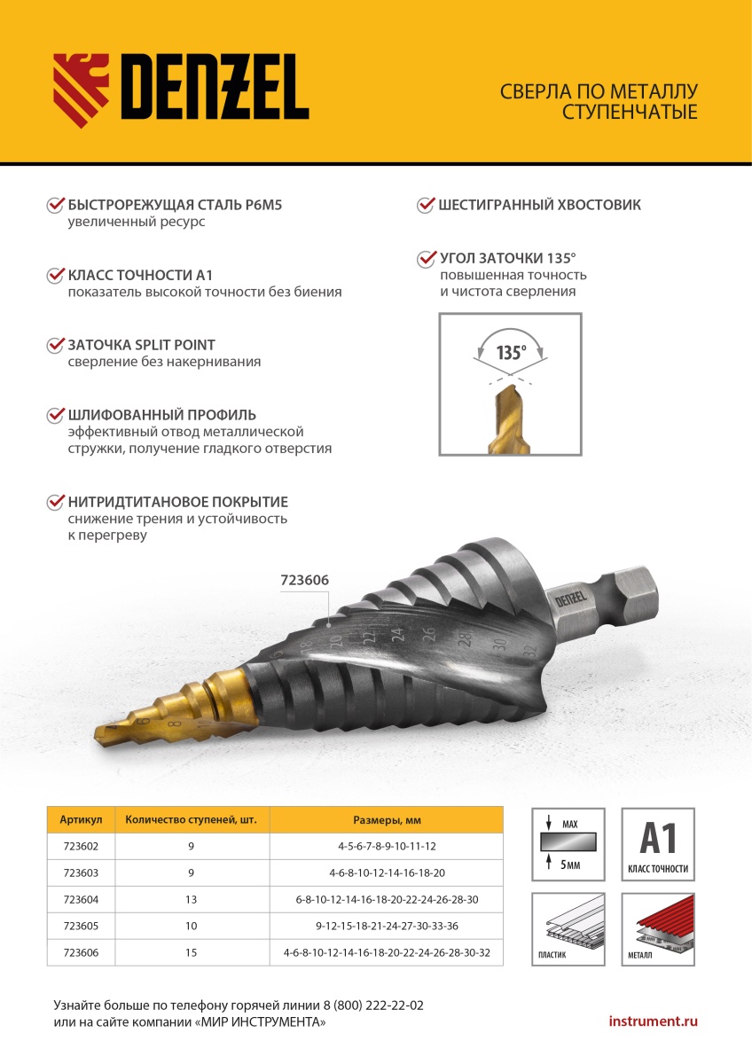 Наличие клапана для сброса давления Сверло ступенчатое 4-6-8-10-12-14-16-18-20 мм, Р6М5, 6-гр. хвостовик Denzel