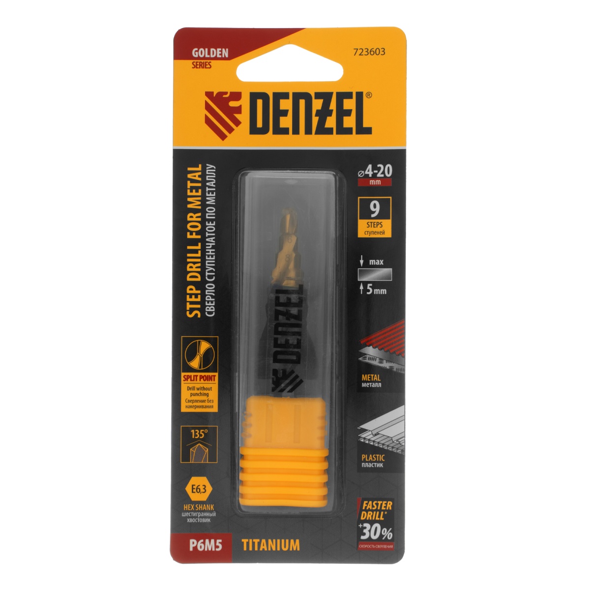 Купить Сверло ступенчатое 4-6-8-10-12-14-16-18-20 мм, Р6М5, 6-гр. хвостовик Denzel V6515 по лучшей цене с доставкой - интернет магазин №1 в России