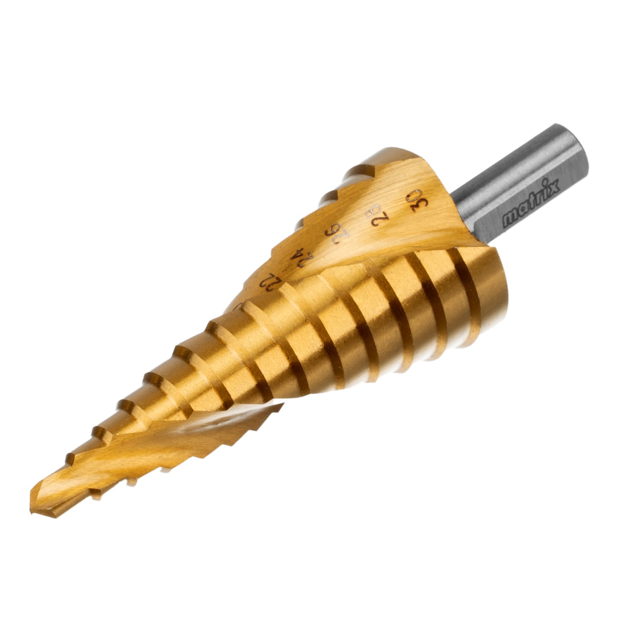 Сверло ступенчатое, 6-8-10-12-14-16-18-20-22-24-26-28-30 мм, HSS, спиральный профиль, трехгранный хвостовик Matrix