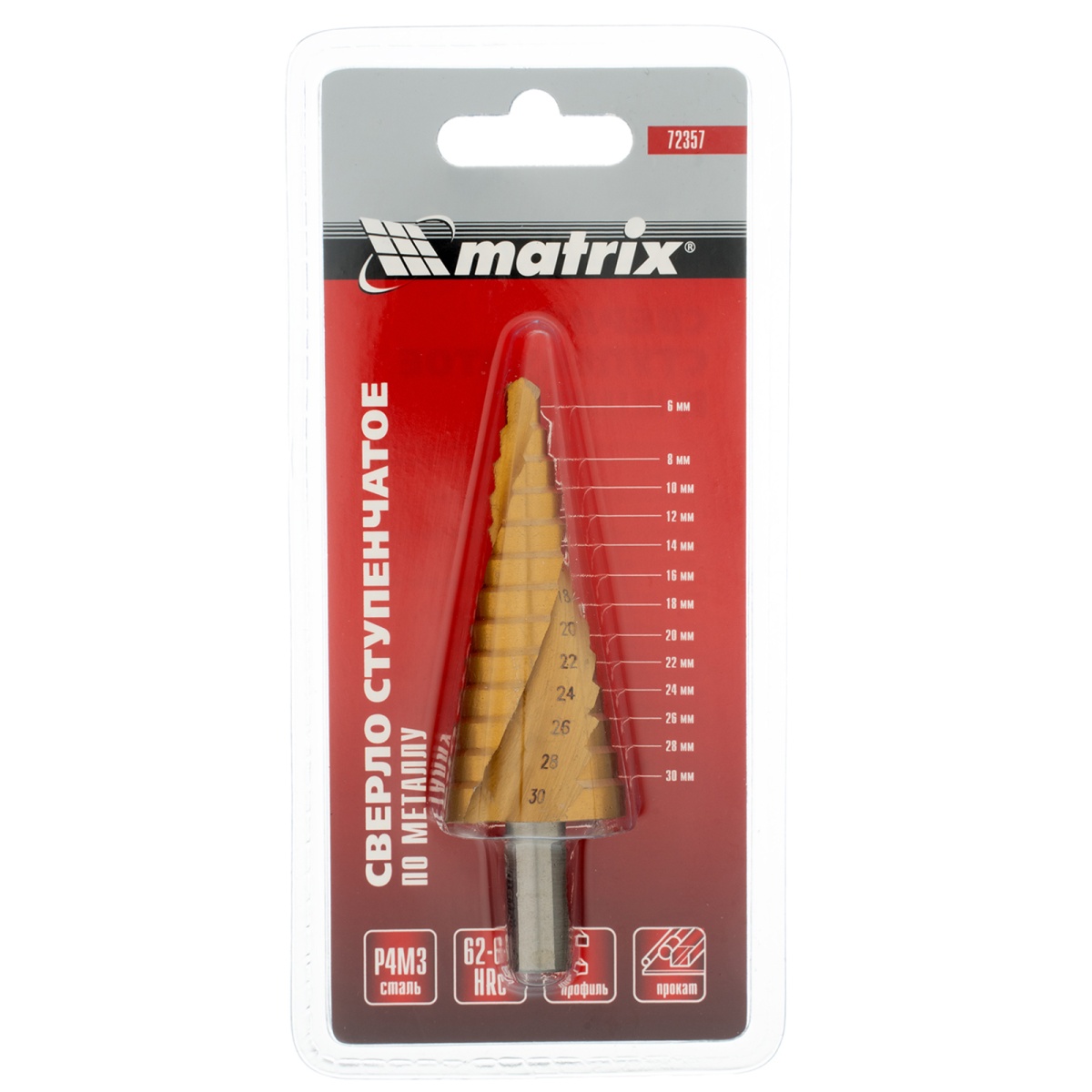 Купить Сверло ступенчатое, 6-8-10-12-14-16-18-20-22-24-26-28-30 мм, HSS, спиральный профиль, трехгранный хвостовик Matrix V6524 по лучшей цене с доставкой - интернет магазин №1 в России