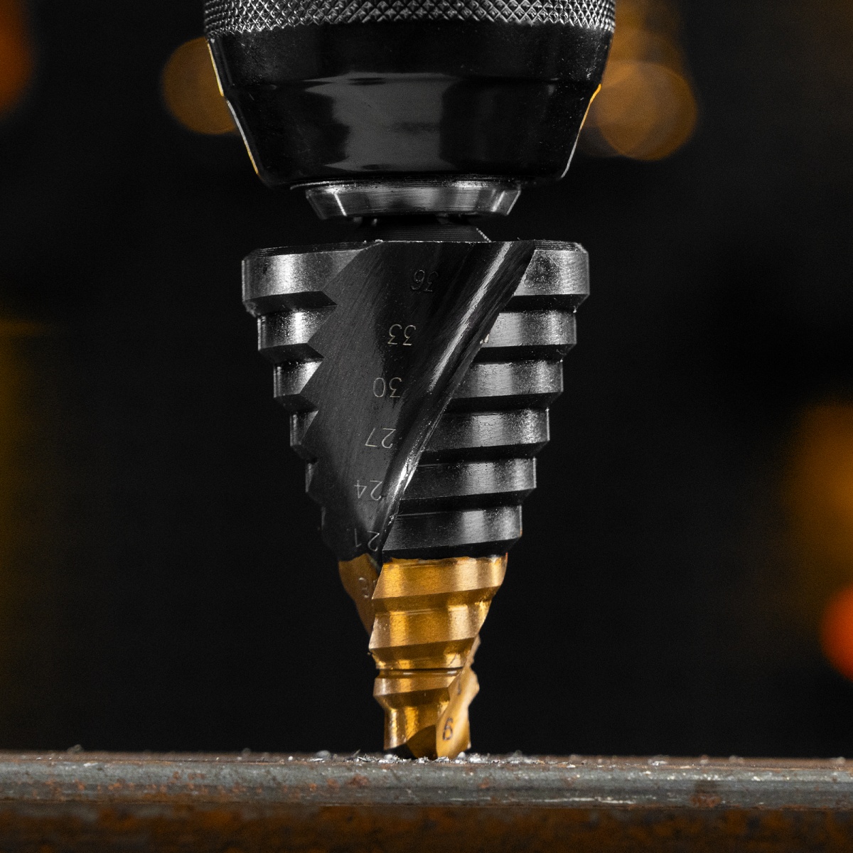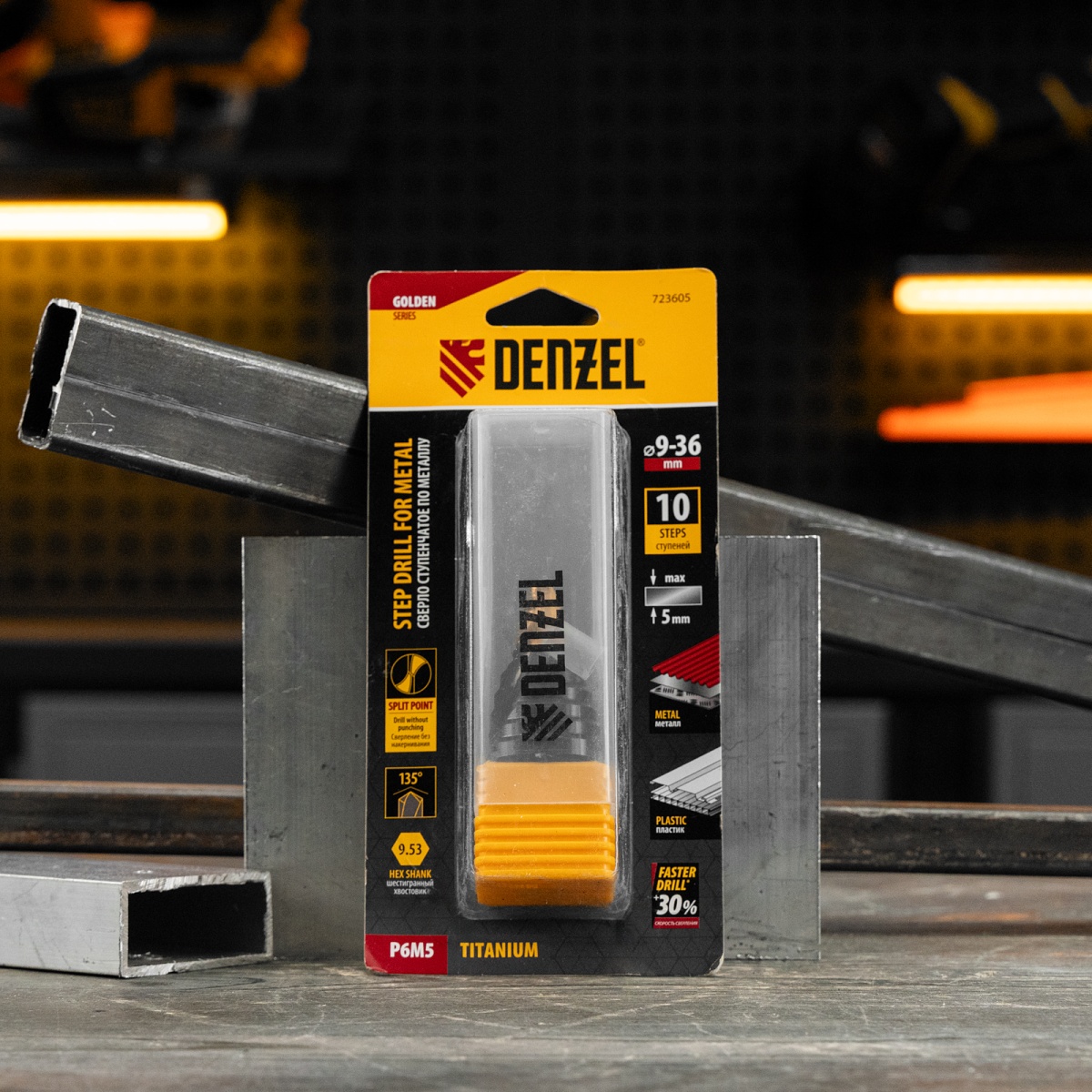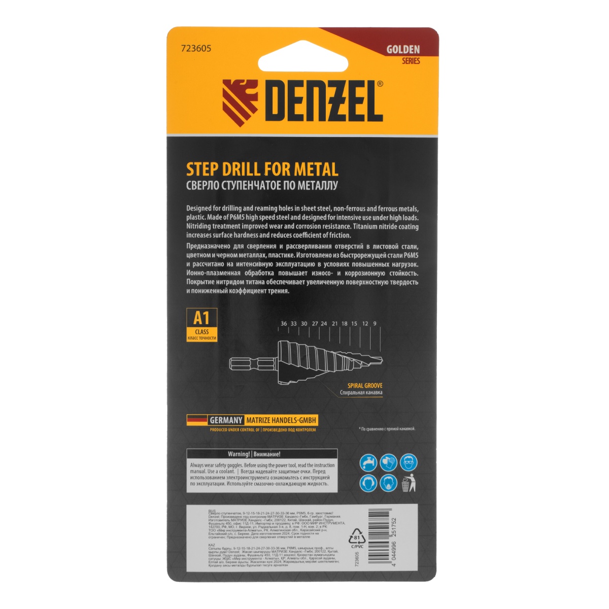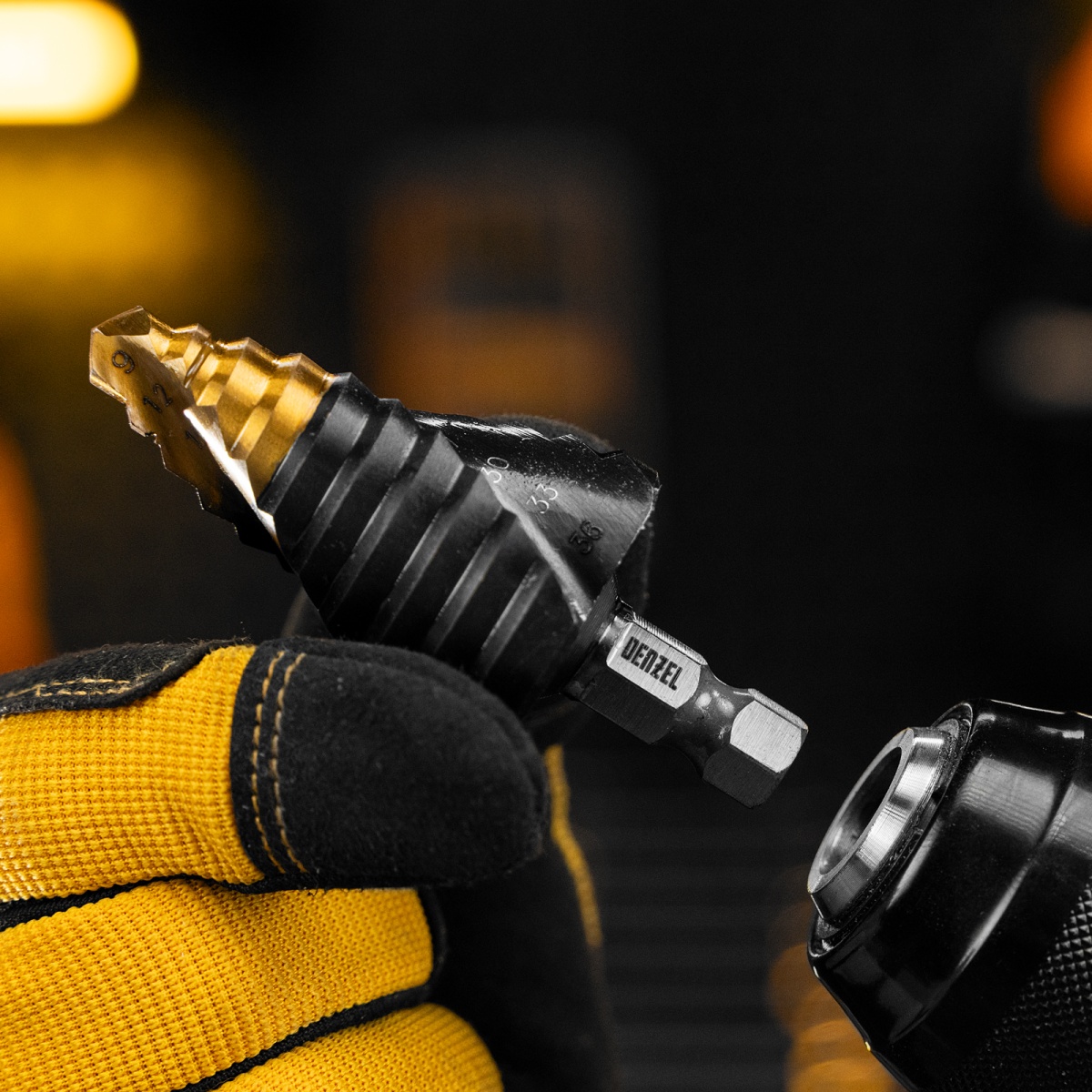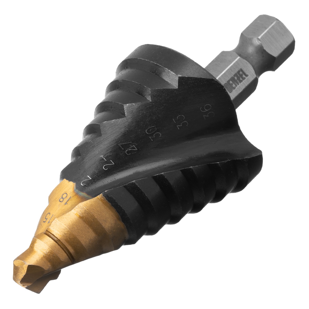 Сверло ступенчатое, 9-12-15-18-21-24-27-30-33-36 мм, Р6М5, 6-гр. хвостовик Denzel
