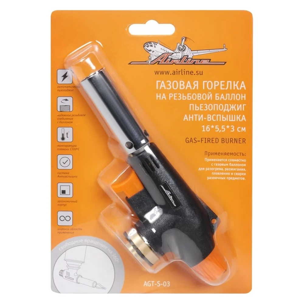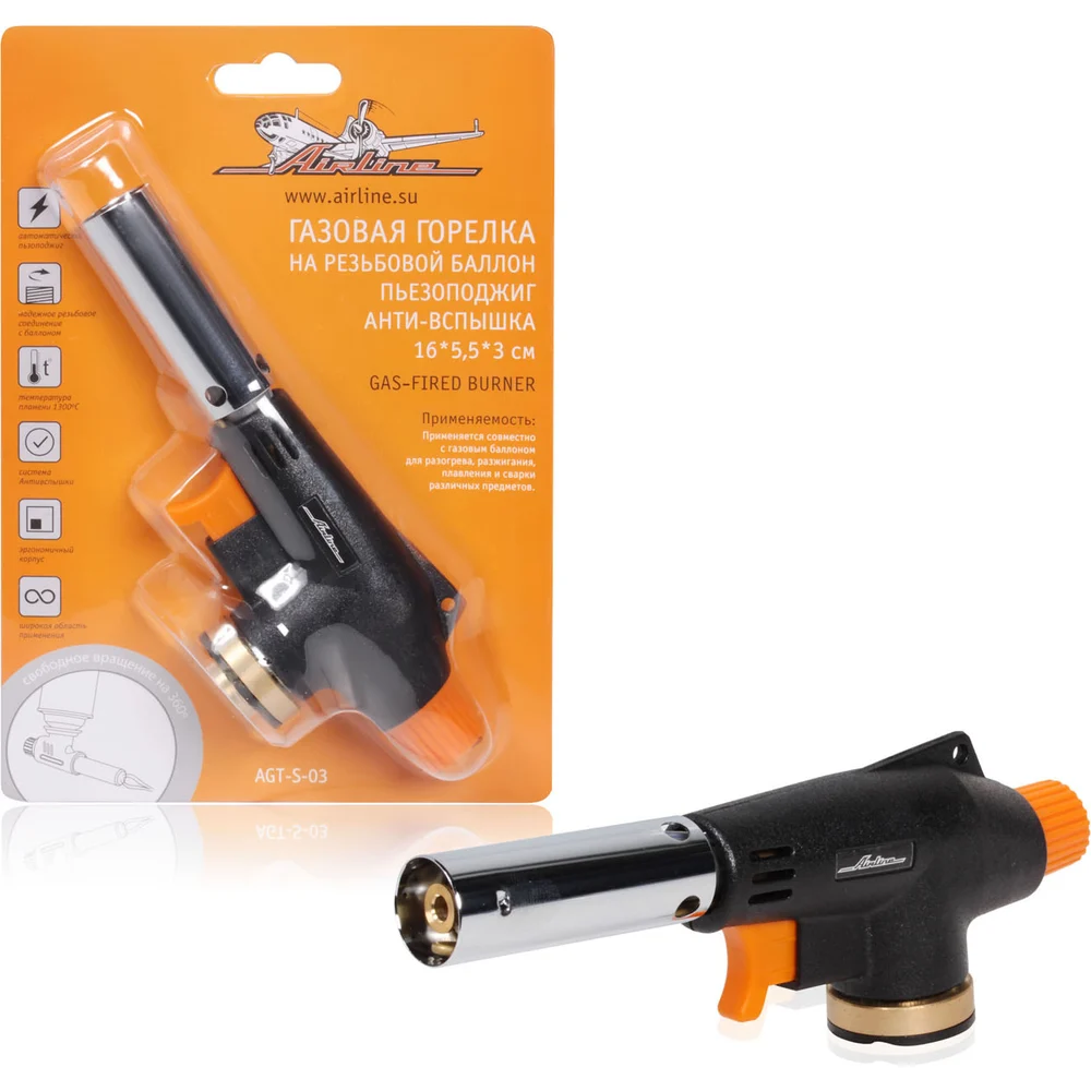 Купить Газовая горелка Airline на резьбовой баллон, пьезоподжиг, анти-вспышка, 16х5,5х3 см AGT-S-03 по лучшей цене с доставкой - интернет магазин №1 в России
