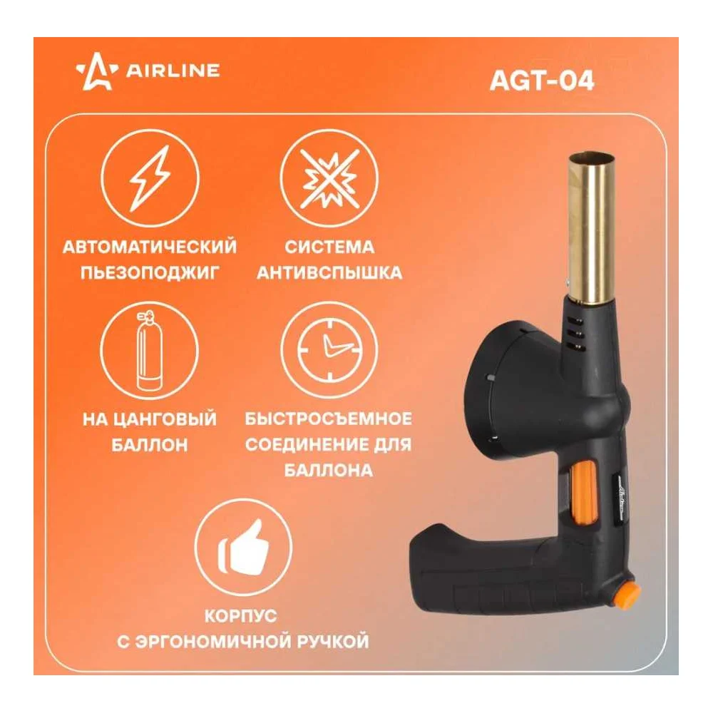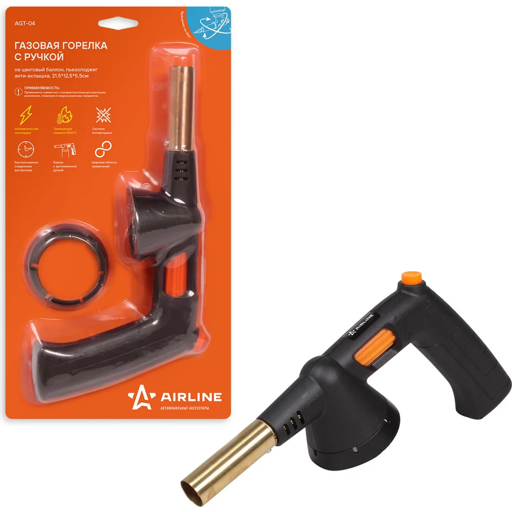 Купить Газовая горелка Airline с ручкой на цанговый баллон, пьезоподжиг, анти-вспышка, 21,5x12,5x5,5 см AGT-04 по лучшей цене с доставкой - интернет магазин №1 в России