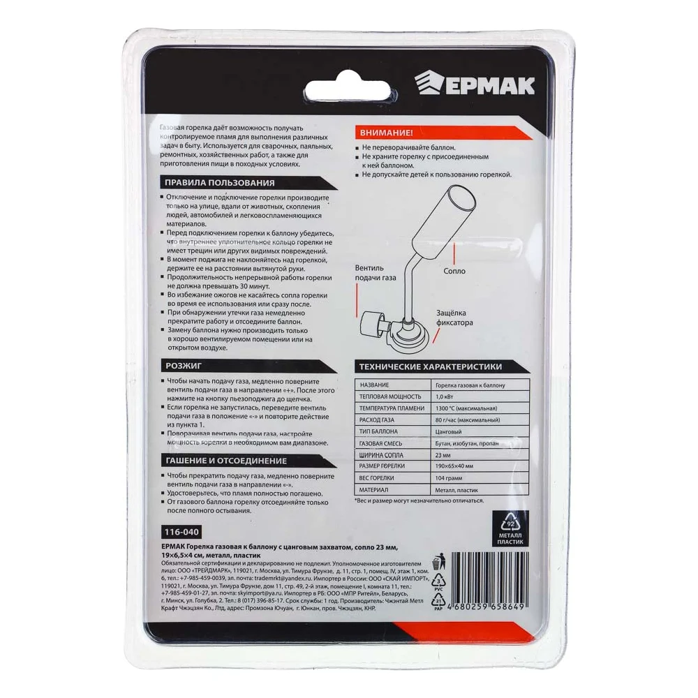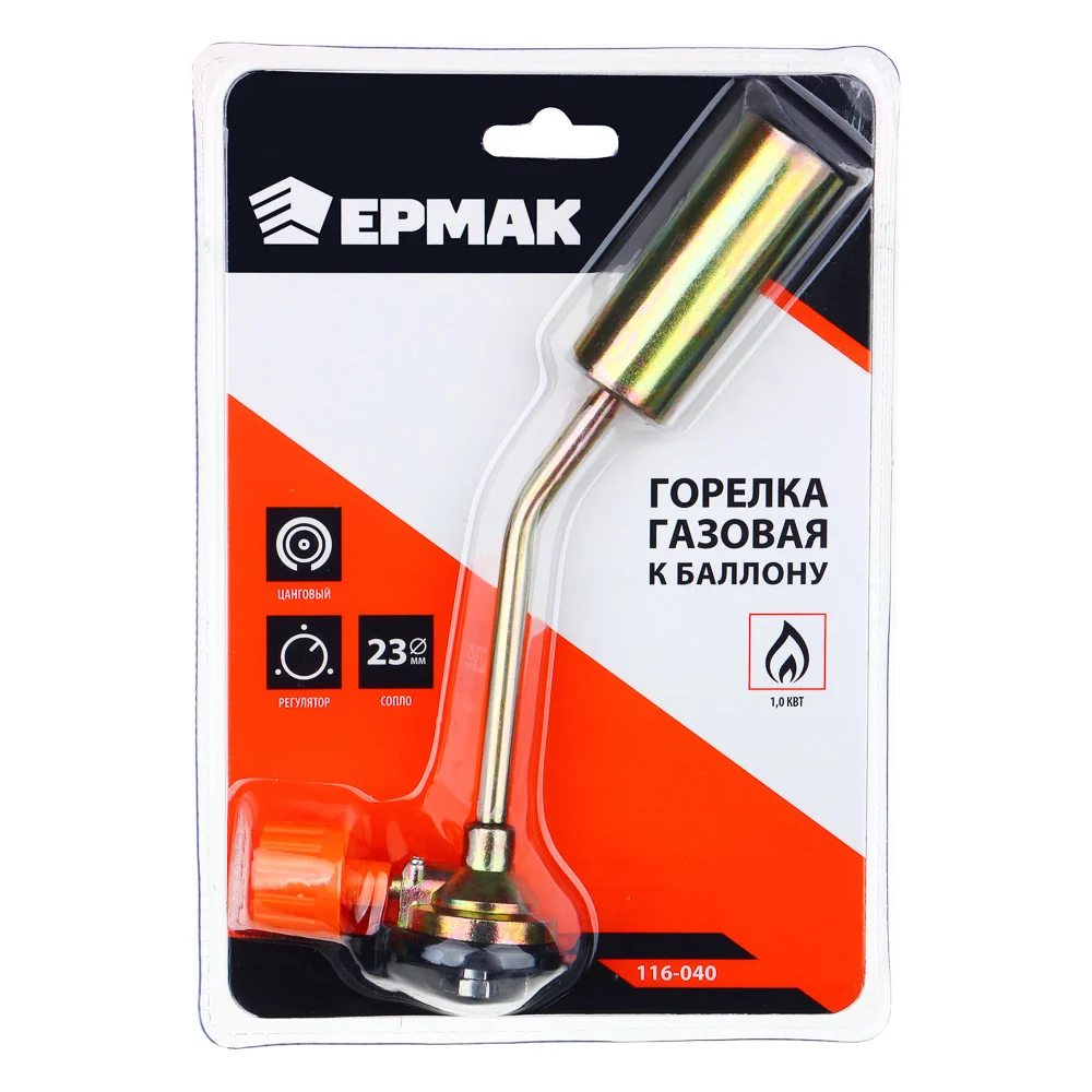 Купить Газовая горелка ЕРМАК к баллону с цанговым захватом, сопло 23 мм, 19x6,5x4 см, металл, пластик 116-040 по лучшей цене с доставкой - интернет магазин №1 в России