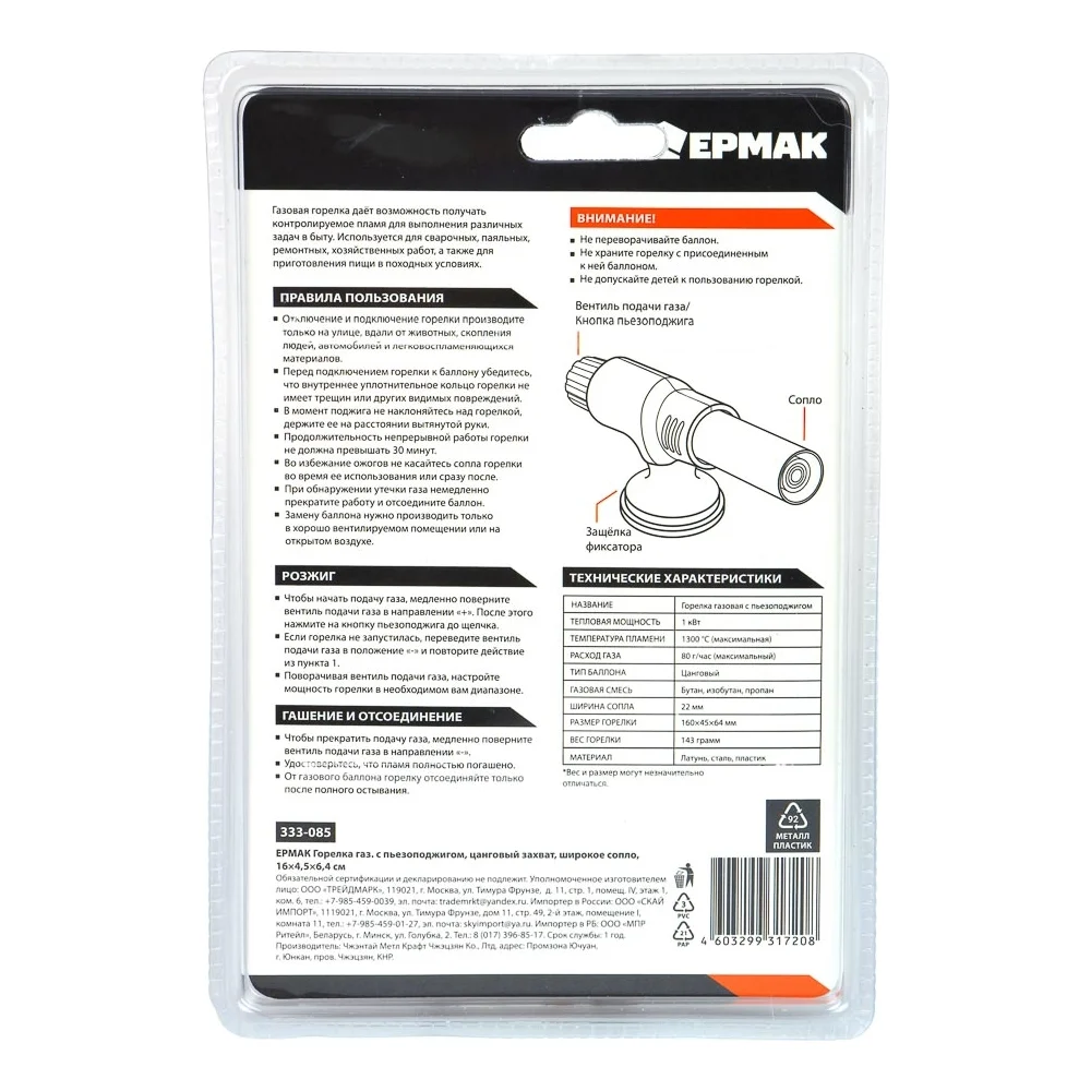 Купить Горелка ЕРМАК с пъезорозжигом, цанговый захват, широкое сопло 333-085 по лучшей цене с доставкой - интернет магазин №1 в России