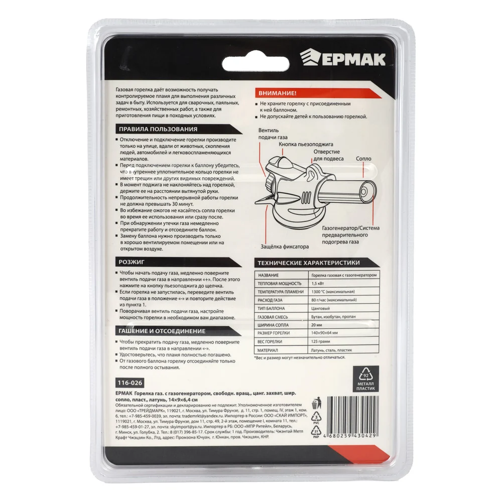 Купить Горелка газ. с пьезо, ЕРМАК свободн. вращ., цанг. захват, шир. сопло, пласт.,латунь; 14х9х5см 116-026 по лучшей цене с доставкой - интернет магазин №1 в России