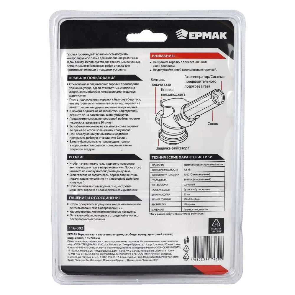 Купить Горелка газ. с пьезорозжигом, ЕРМАК свободн. вращ., цанговый захват, шир. сопло; 15х4х7см 116-002 по лучшей цене с доставкой - интернет магазин №1 в России