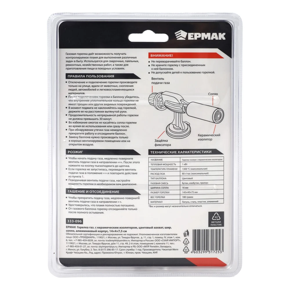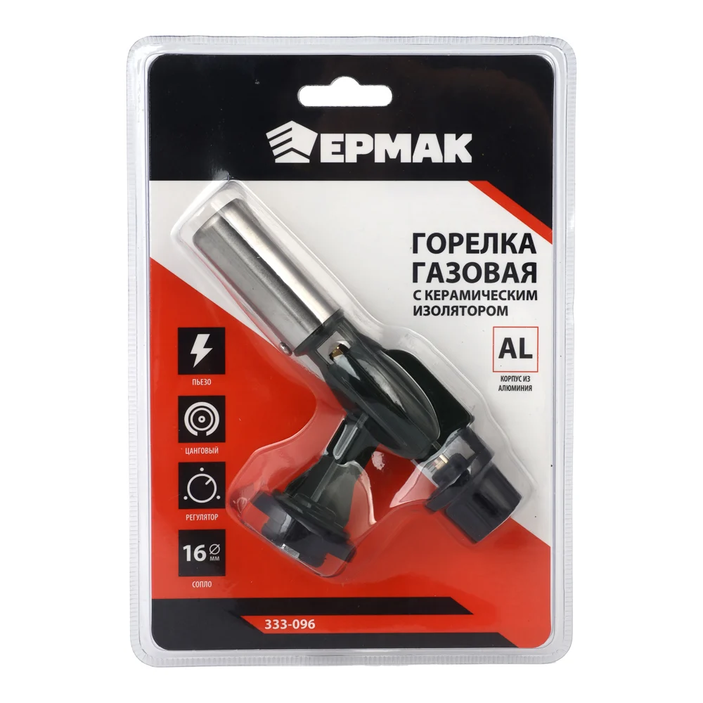 Купить Горелка газ. с пьезорозжигом, ЕРМАК цанговый захват, шир. сопло, алюминиевый корпус, 14х4х7,5см 333-096 по лучшей цене с доставкой - интернет магазин №1 в России