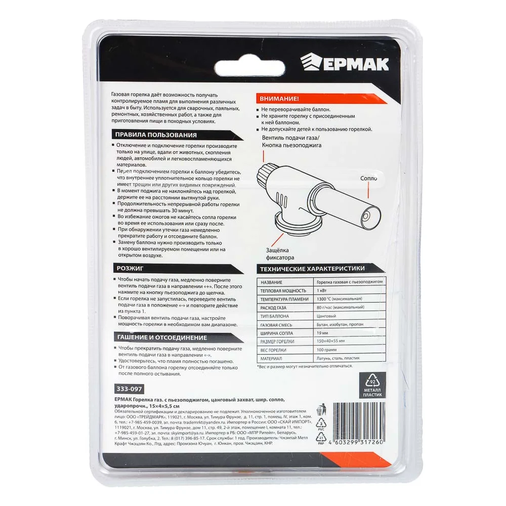 Купить Горелка газ. с пьезорозжигом, ЕРМАК цанговый захват, шир. сопло, ударопрочн.; 15х4х5,5см 333-097 по лучшей цене с доставкой - интернет магазин №1 в России