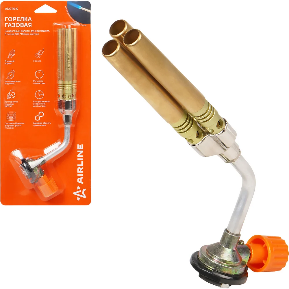 Купить Горелка газовая Airline на цанговый баллон, ручн.поджиг, 3 сопла D12x102мм, металл ADGT010 по лучшей цене с доставкой - интернет магазин №1 в России