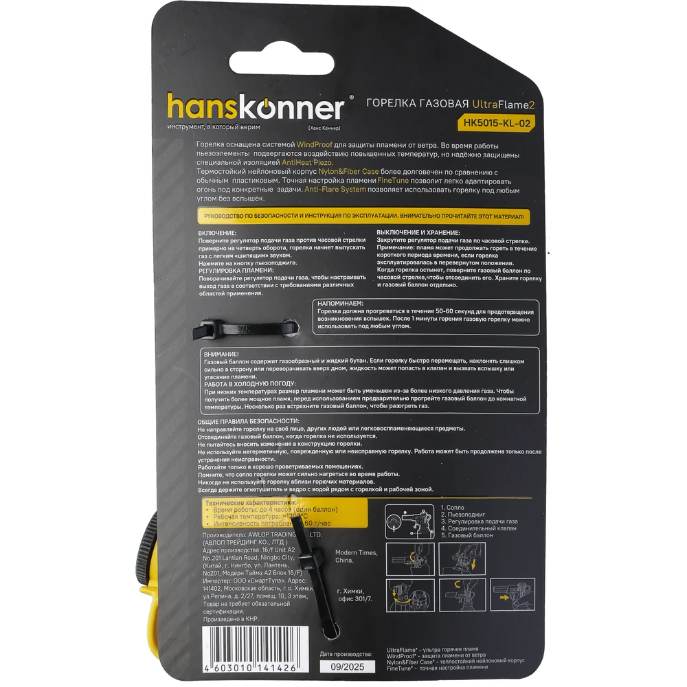 Купить Горелка газовая Hanskonner пьезоподжиг, керамика в сопле, защита от вспышек HK5015-KL-02 по лучшей цене с доставкой - интернет магазин №1 в России