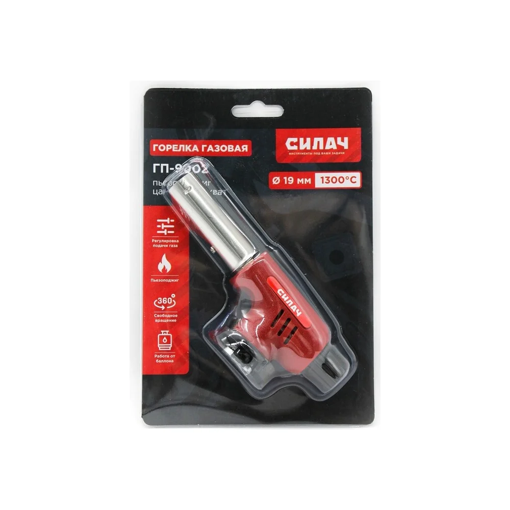 Купить Горелка газовая СИЛАЧ ГП -9002 пьезо, с цанговым захватом, сопло 19мм, 15,5х5х6 см 025584 по лучшей цене с доставкой - интернет магазин №1 в России