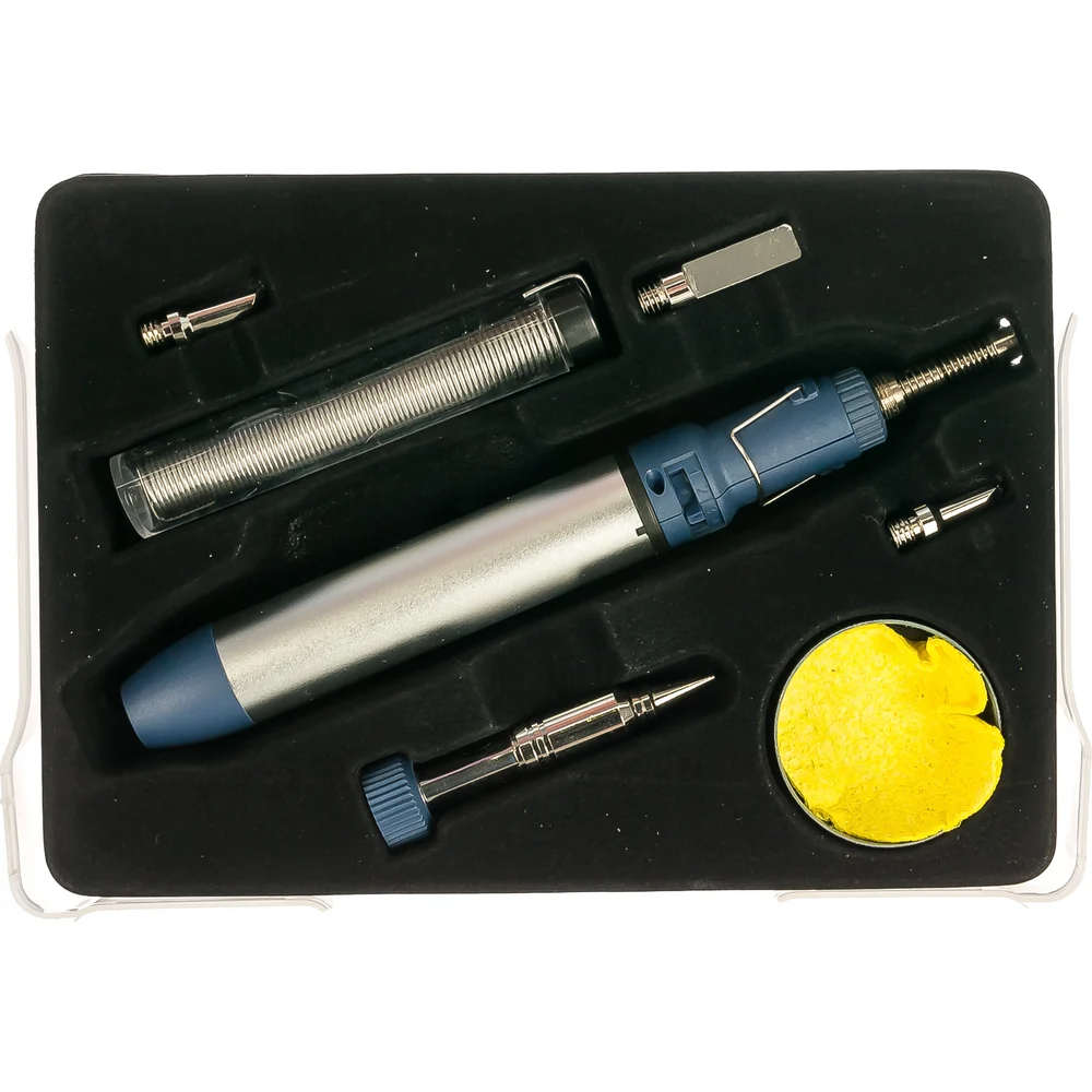 Комплектация - газовый паяльник на пропан- бутане,- дополнительные насадки,- припой в катушке,- губка для чистки наконечника паяльника.