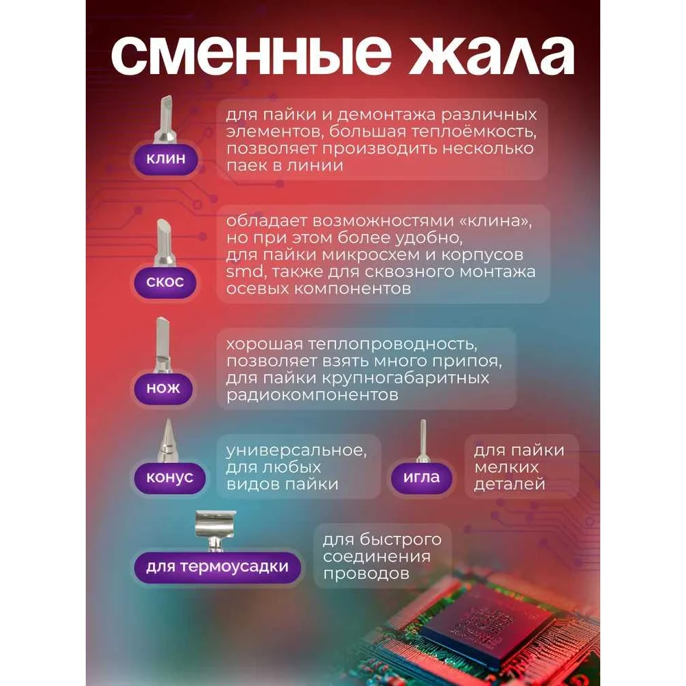 Комплектация Паяльник; Припой; Канифоль; Насадки 6 шт; Кейс