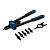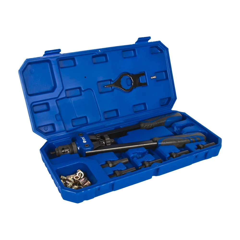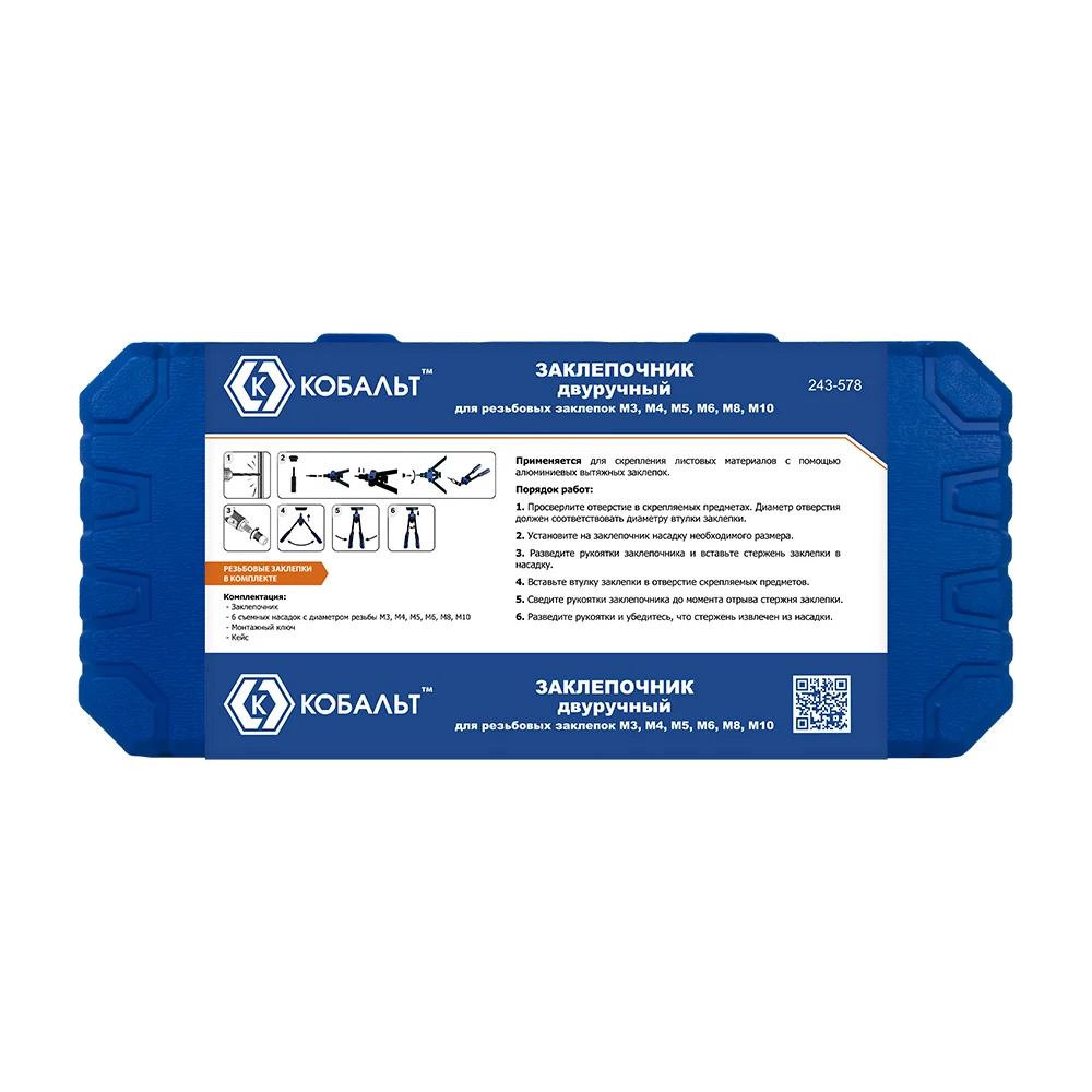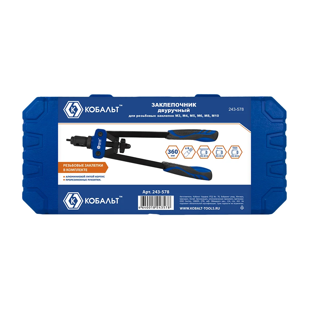 Комплектация Двуручный заклепочник КОБАЛЬТ 360мм 243-578; 6 съемных насадок с диаметром резьбы М3, М4, М5, М6, М8, М10; Монтажный ключ; Кейс