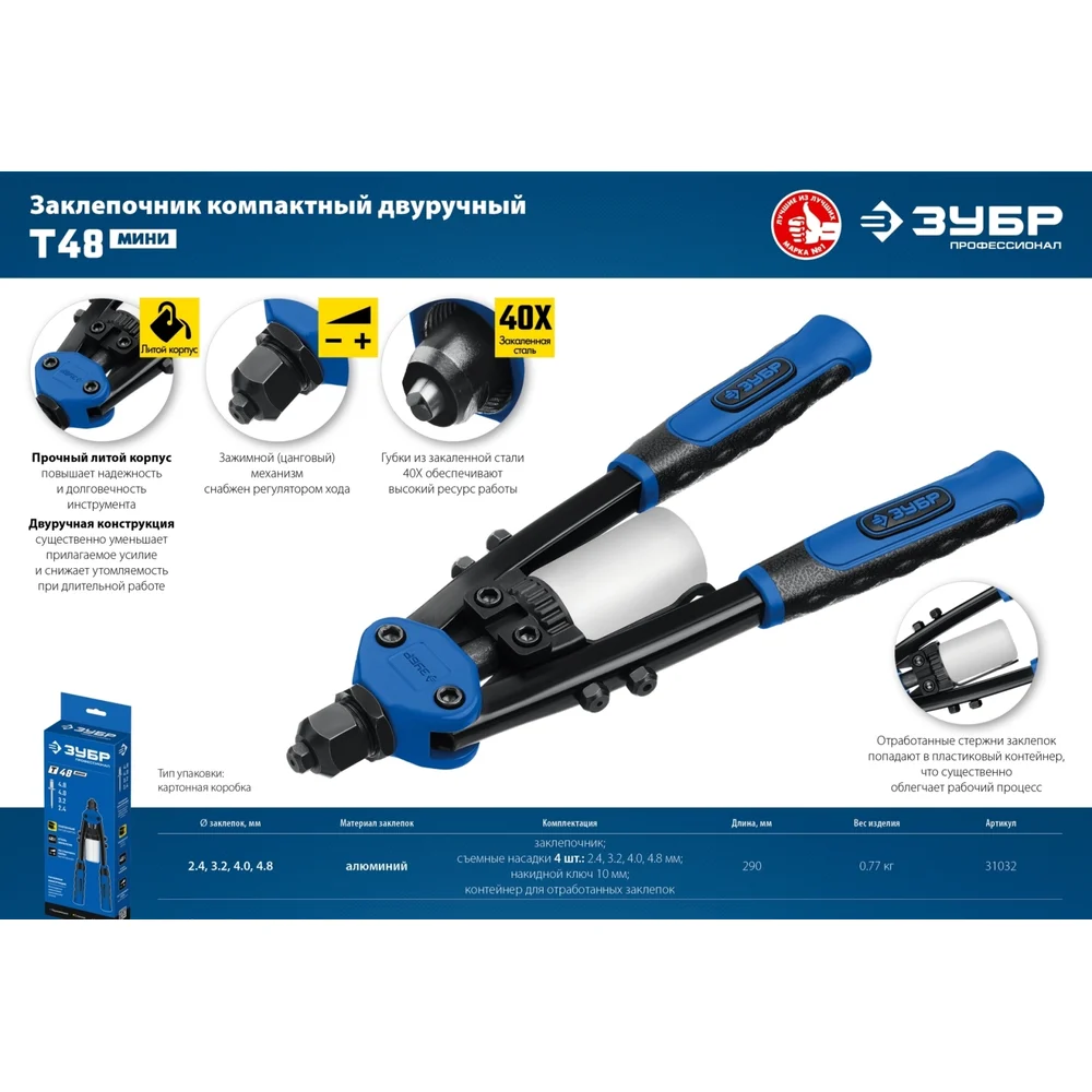 Купить Компактный двуручный заклепочник ЗУБР Профессионал Т-48 290 мм, 2.4 - 4.8 мм 31032_z01 по лучшей цене с доставкой - интернет магазин №1 в России