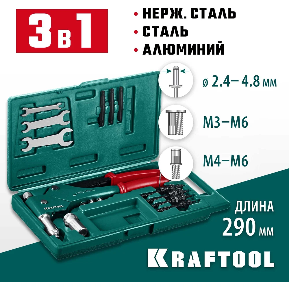 Купить Поворотный заклепочник KRAFTOOL Combo3-M6 360°, комбинированный, в кейсе, 3 вида заклёпок по лучшей цене с доставкой - интернет магазин №1 в России