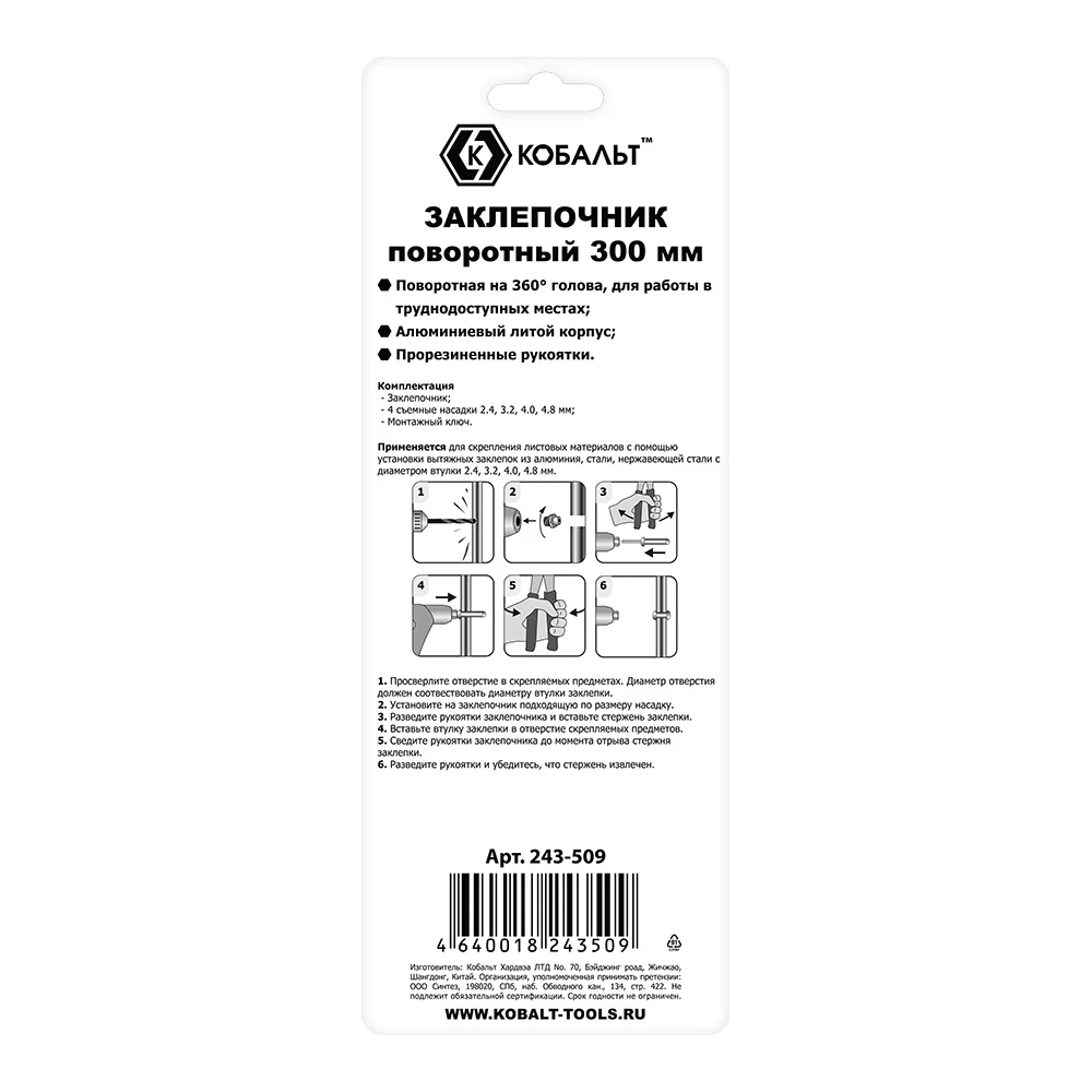 Купить Заклепочник КОБАЛЬТ 300 мм, поворотный 0-360 градусов 243-509 по лучшей цене с доставкой - интернет магазин №1 в России