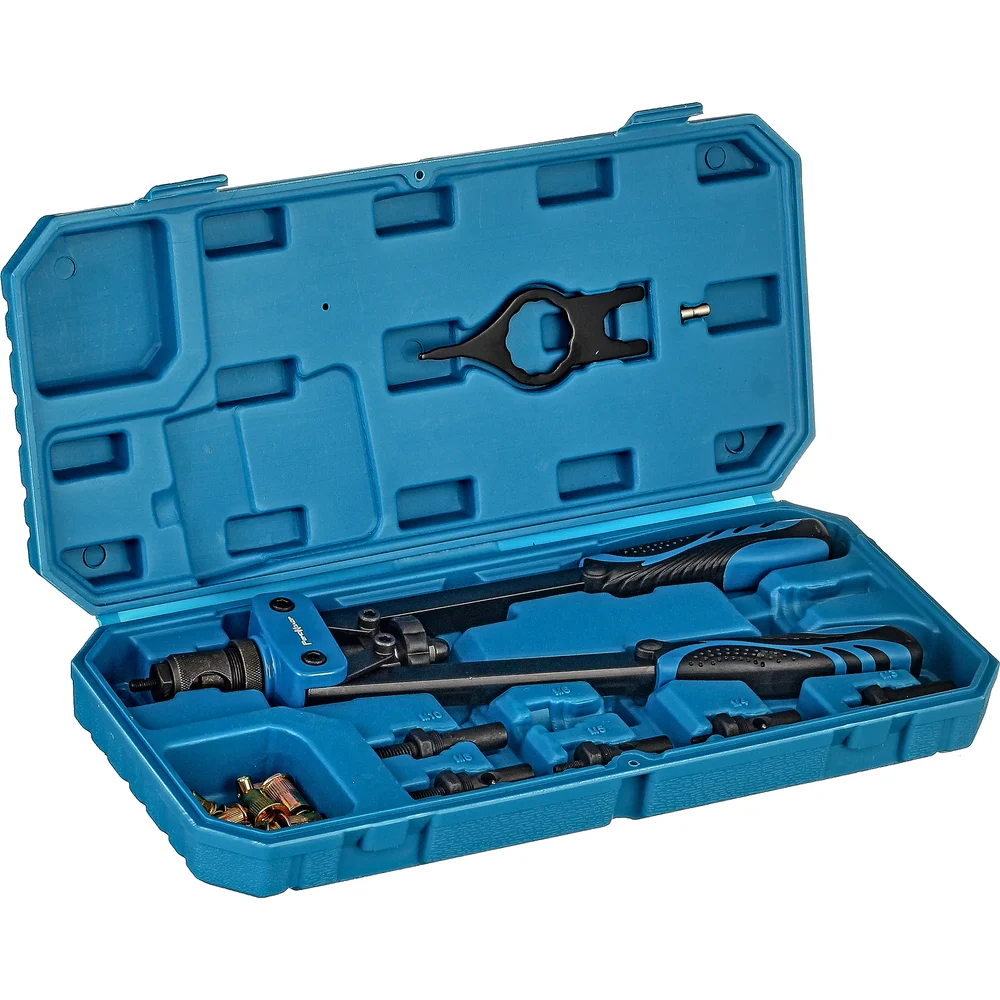 Комплектация Заклепочник резьбовой двуручный 360 мм, литой корпус; Насадки M3, M4, M5, M6, M8, M10 кейс