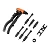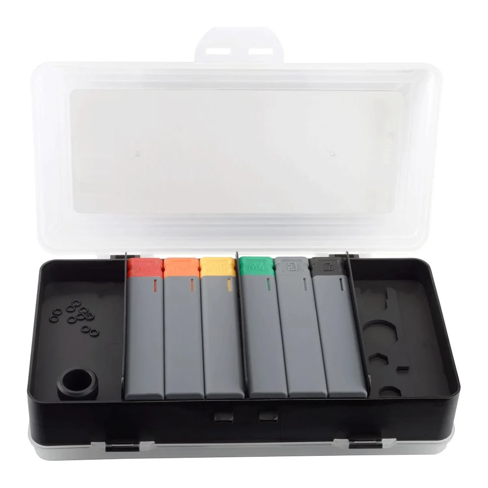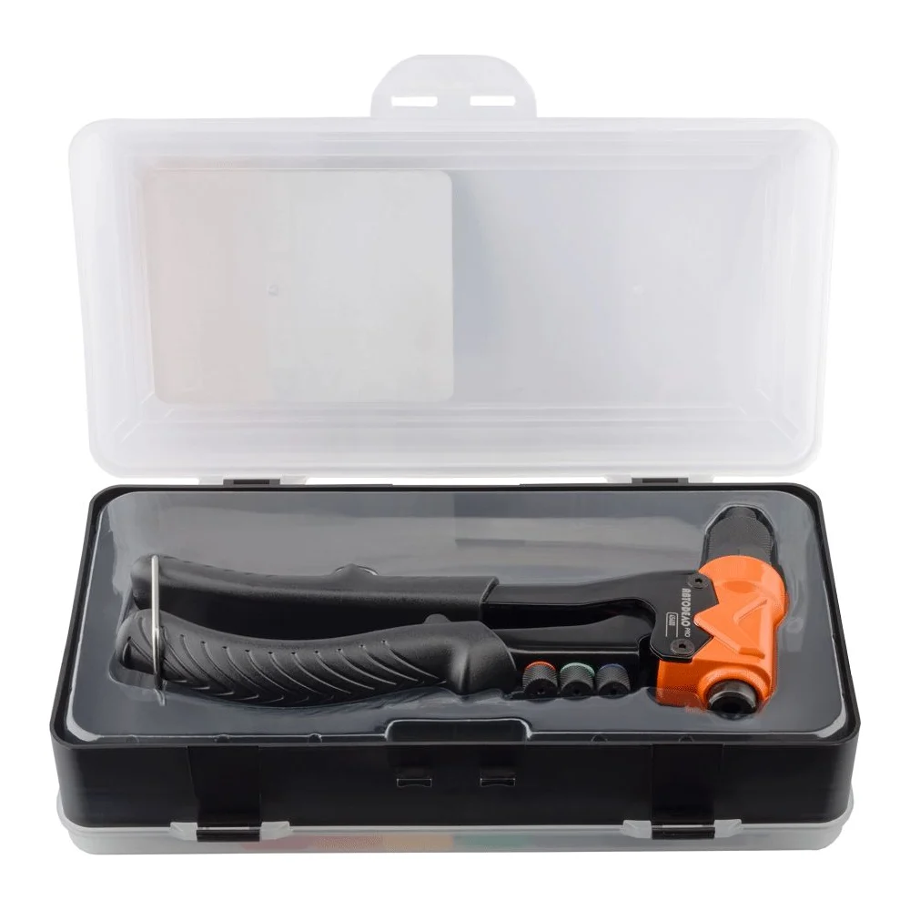 Комплектация Заклёпочник; Держатель насадок для работы с вытяжными заклёпками; Сменные насадки: 2.4, 3.2, 4.0, 4.8 мм; Тяга для работы с вытяжными заклёпками; Сменные насадки с резьбой: M3, M4, M5, M6; Направляющая втулка для работы с резьбовыми заклёпками; Насадки для просечки: круглая, квадратная; Направляющая втулка для работы с просекателем; Гайка для фиксации оснастки; Ключ для замены оснастки