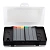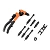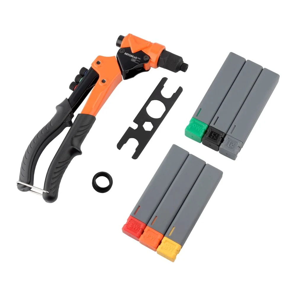Комплектация Заклёпочник; Держатель насадок для работы с вытяжными заклёпками; Сменные насадки: 2.4, 3.2, 4.0, 4.8 мм; Тяга для работы с вытяжными заклёпками; Сменные насадки с резьбой: M3, M4, M5, M6; Направляющая втулка для работы с резьбовыми заклёпками; Насадки для просечки: круглая, квадратная; Направляющая втулка для работы с просекателем; Гайка для фиксации оснастки; Ключ для замены оснастки