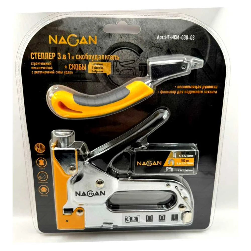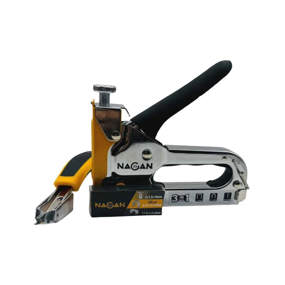Купить Набор степлер NAGAN 3в1 (скобоудалитель, скобы (3х100 шт) строительный Тип U,T,П) металлический, регулировка удара, двухкомпонентная рукоятка НГ-НСМ-030-03 по лучшей цене с доставкой - интернет магазин №1 в России