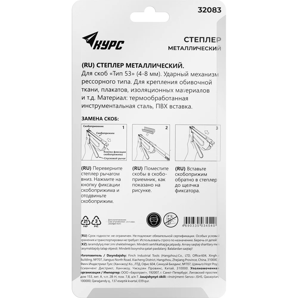 Купить Степлер для узких скоб КУРС тип 53 4-8 мм, металлический корпус 32083 по лучшей цене с доставкой - интернет магазин №1 в России