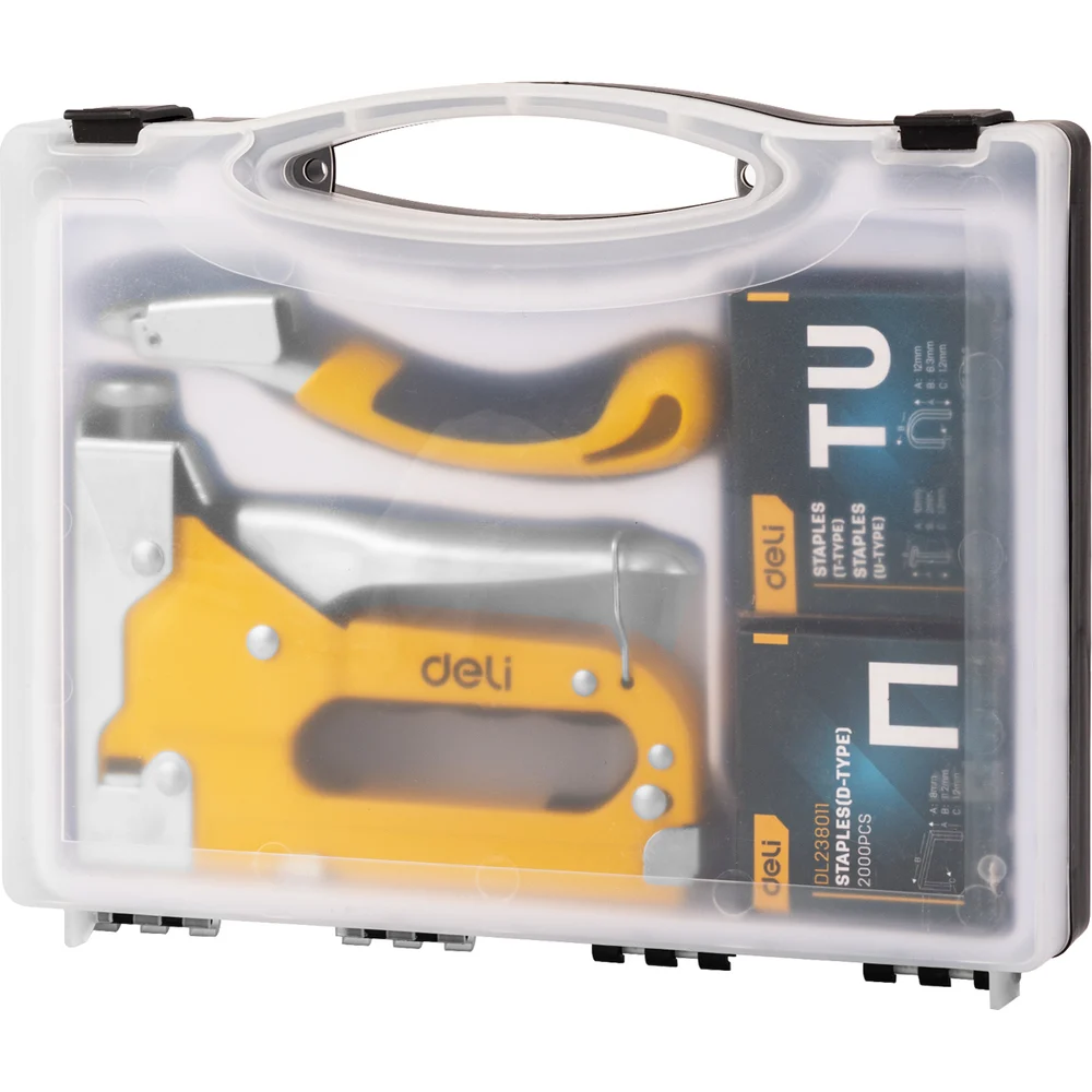 Строительный мебельный степлер DELI металлический с регулировкой + антистеплер DL238105 с набором скоб в кейсе (Тип «П» 4-14мм, «U» 10-12мм и «T» 10-14мм по 2000шт каждых) 98418