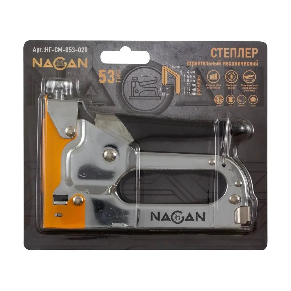 Строительный набор NAGAN степлер, скобоудалитель, скобы, тип 53 4-14 мм, металлический, регулировка удара, двухкомпонентная рукоятка НГ-НСМ-053-022-2
